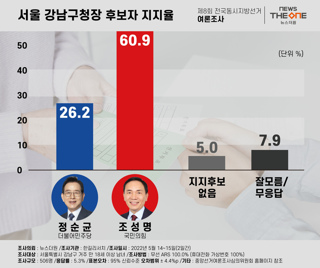 뉴스더원 주관으로 한길리서치가가 실시한 이번 여론조사는 5월 14일에서 5월 15일 사이 강남구 거주 만 18세 이상 남녀 506명을 대상으로 무선전화 응답비율은 100% 조사로 진행하였으며 자세한 사항은 중앙선거여론조사심의위원회 홈페이지를 확인하시기 바랍니다.