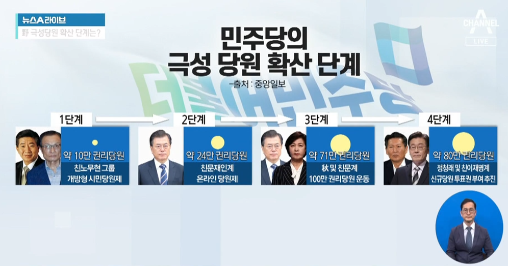 지금 더불어민주당내 주요 팬덤정치는 문재인 대통령을 지지하는 친문그룹이 주요 지지자들이었습니다. 이는 더불어민주당의 계파를 따라가봐야하는데 2011년부터 열린 정당으로 나아가면서 온라인 권리당원이 늘었고 이들의 힘으로 정권을 가지고 오기도 했습니다. 이 덕분에 일반 시민의 정치참여를 쉽게 하고, 지지층의 확대 등을 가지고 올 수 있었고 이 덕분에 2017년 기준 권리당원의 수가 70만명이 넘으며 양적 성장을 이뤘고 강성 지지층을 만들며 질적 성장도 동시에 가지고 올 수 있었습니다.