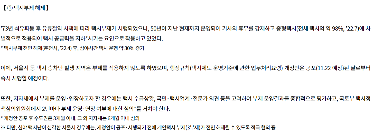 택시부제를 시행한 시점인 1973년은 당시 석유파동 이후 에너지 절약을 주요 목적으로 실시하였으며 이로 인하여 택시 공급력을 떨어트리는 문제 중 하나로 지적받았으며 이를 위하여 여객자동차 운수사업법령을 개정하여 규칙 개정안 공포 후 다음 날인 11월 22일부터는 개인택시 부제가 바로 해제됩니다. 다만, 지자체에서는 부제를 유지하기 위하여 택시 수급 상황이나 전문가 의견 등을 고려하여 국토부 택시정책심의위원회를 통하여 연장할 수는 있지만 현재의 상황에서는 부제를 연장하는 수도권 도시는 적을 것으로 평가됩니다.