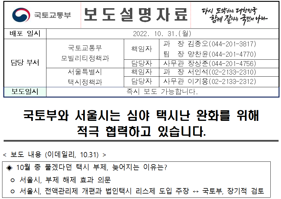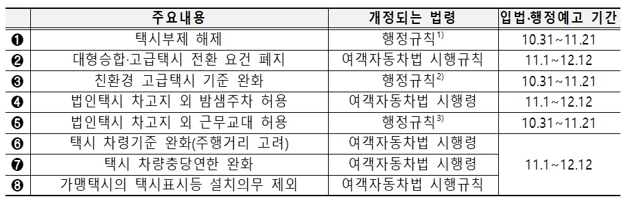 아울러 법인 택시는 차고지 외에 밤샘 주차도 허용하고 근무 교대도 허용하는데 이를 완화하면 그간 심야운행 후 차고지에서 근무교대를 해야했는데 이러한 문제점을 개선하여 승객 골라태우기 문제를 개선함과 동시에 택시 공급량을 늘릴 수 있는 모양입니다.