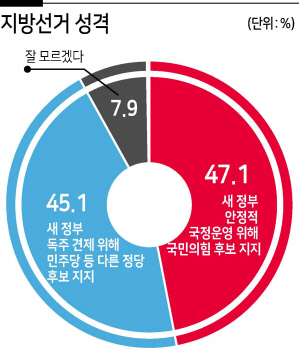 지난 대선에서 경기도는 전직 지사였던 이재명 지사의 후광덕분인지 윤석열 후보에게 앞서는 결과를 받았습니다 그러다보니 이번 선거에서는 서로에게 격전지가 되었는다 이번 여론조사에서는 국민의힘 김은혜 후보가 41.8%로 더불어민주당 김동연 후보 42.%, 무소속 강용석 후보 5.1%로 더불어민주당 김동연 후보가 어쨌든 앞서고 있는 결과를 받았습니다. 하지만 김은혜-강용석 후보 간 단일화에 대한 이야기가 솔솔 나오고 있는 상황과 지방선거에 대한 안정적 국정운영을 위해 국민의힘 지지가 47.1%, 새 정부 독제를 견제 하기 위해 다른 정당 지지를 하겠다는 비율이 45.1%로 나타난 점을 고려하면 앞으로 선거에 따른 여론 변화 추이를 지켜보는 것이 중요할 것으로 생각됩니다.