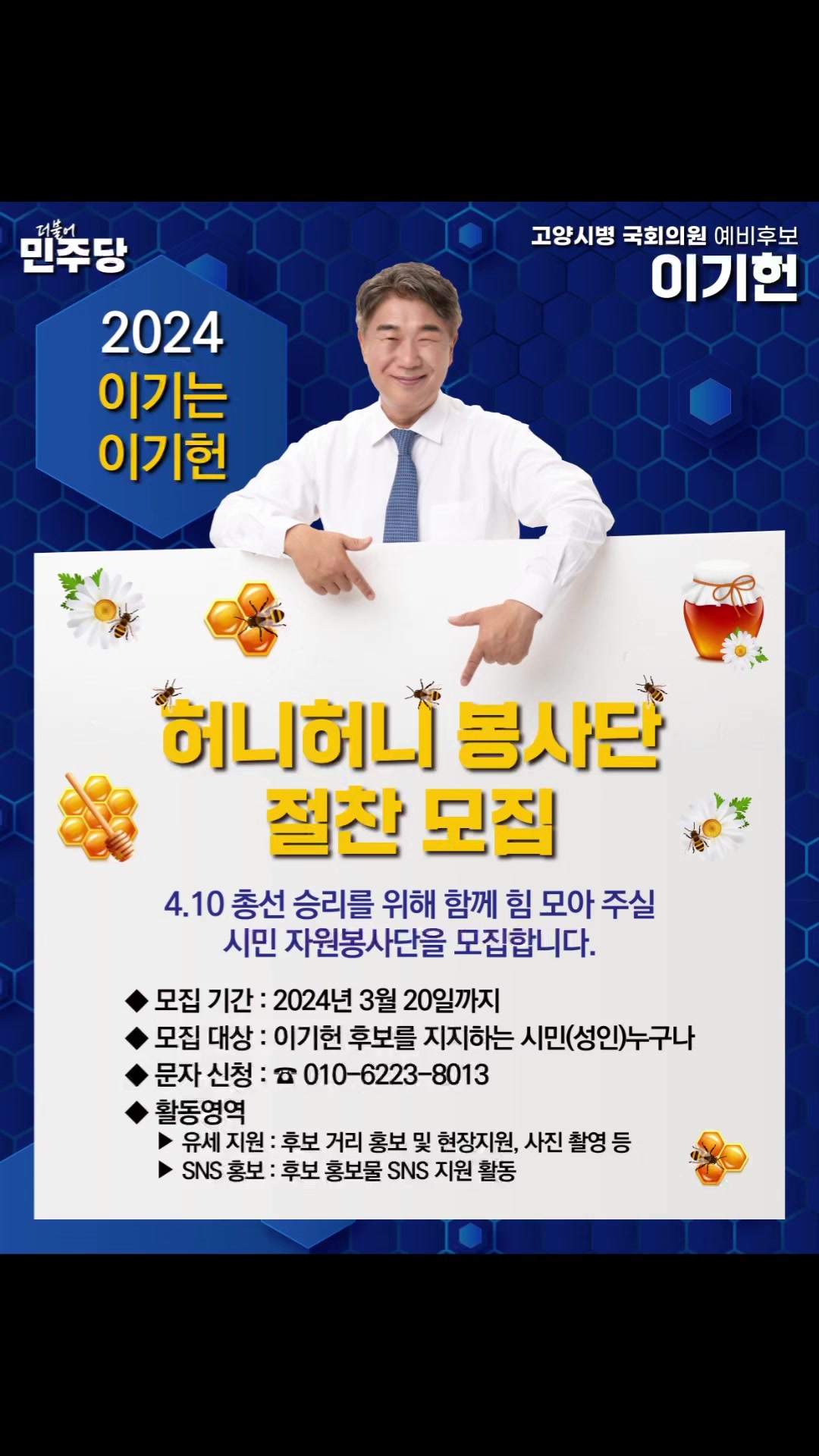 더불어민주당 소속 이기헌 후보는 경기 고양병 지역구에서 국회의원에 출마하였습니다. 그는 김근태 국회의원의 비서 출신으로 민주당에서 약 20년 동안 조직국장, 총무국장, 국제국장 등 당직자로 활동하였습니다. 또한, 문재인 정부 청와대에서 5년간 민정비서관, 시민참여비서관, 재외동포담당관 등을 역임하였습니다. 이기헌 후보는 경희대학교 무역학과를 졸업하였으며, 경희대학교 총학생회장으로 활동한 경력도 가지고 있습니다. 현재는 더불어민주당 정책위부의장과 고양시병 지역위원장을 맡고 있습니다.