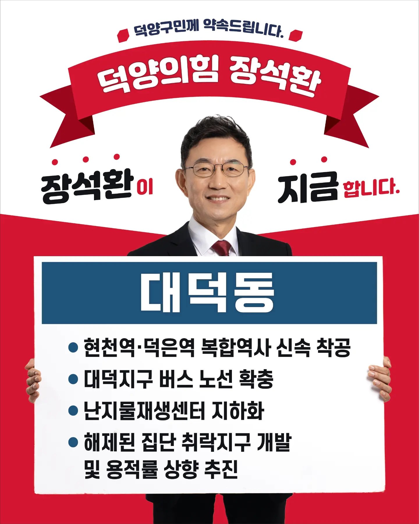 장석환 후보의 주요 활동 중 하나는 '덕양, 새로 태어나다! (장석환이 설계하는 실크로드 덕양 프로젝트)'라는 발전 로드맵을 발표하는 것입니다6. 그는 이 로드맵을 통해 북한산에서 한강까지 비단같이 연결된 새로운 물의 도시, 강변도로 대심도 다목적 터널, 고양은평선의 경의중앙선 연결, 서울특별시 덕양구, 기득권 포기 등의 프로젝트를 제안하였습니다. 그는 이를 통해 덕양구의 미래와 비전을 제시하고, 덕양구의 암흑기를 끝내겠다는 포부를 밝혔습니다.