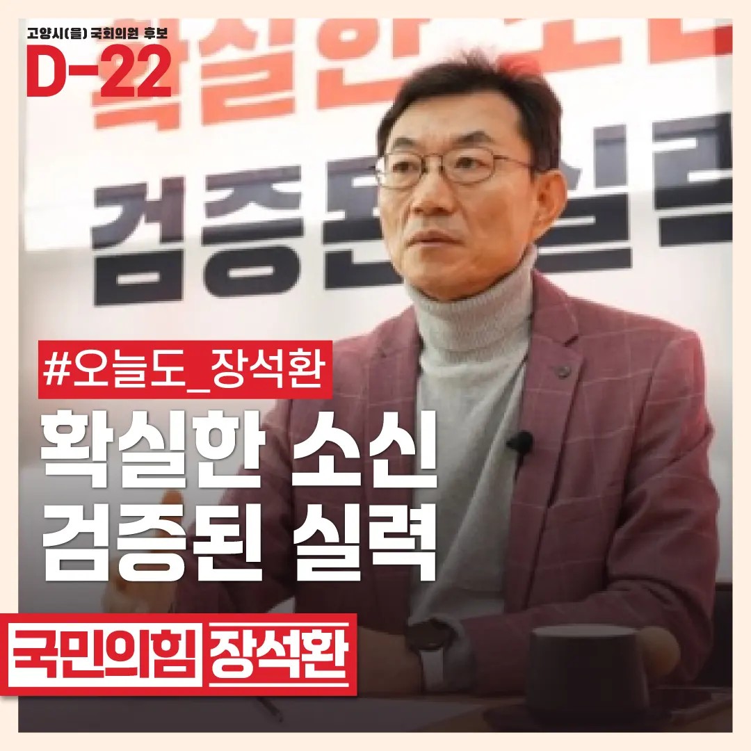 장석환 후보는 경기 고양시을 지역구에서 국민의힘의 국회의원 후보로 나섰습니다1. 그는 대진대학교 스마트건설환경공학부 교수로 재직하면서 아시아 국회의원 물 협의회 사무처장, KBS 객원뉴스 해설위원/재난방송 전문위원, 국민의힘 재해대책위원회 부위원장 등을 역임했습니다. 고양시을 지역구는 고양시 덕양구의 일부를 포함하고 있습니다. 이 지역은 고양시의 주요 선거구 중 하나로, 고양시는 대략 25만명 정도로 지역구가 나뉘며, 덕양구는 고양시갑과 고양시을 두 개로 나뉩니다