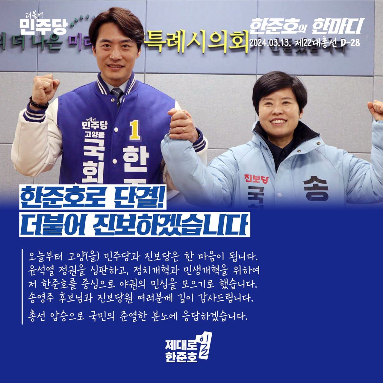 더불어민주당 한준호 후보는 경기 고양시을 지역구에서 재선에 도전하였습니다. 그는 전국 선거구별로 야권 단일화 논의가 한창인 가운데 경기 ‘고양을’ 선거구에서 더불어민주당과 진보당이 한준호 후보로 단일화에 성공했다고 밝혔습니다. 한 후보는 “이번 총선은 윤석열 정권에서 시작된 거대한 퇴행을 멈추고, 기본부터 바로 선 대한민국으로 다시 나아가기 위한 변곡점이 될 것”이라고 주장했습니다.