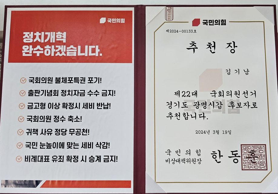 김기남 후보는 국민의힘 광명갑 선거구의 후보로 선출되었습니다1. 그는 "문제아 정치를 끝내고 모범생 정치를 시작하는 것"이라는 시대정신을 강조하며, 좋은 사람이 정치권에 들어와야 좋은 정치가 될 수 있다고 주장하였습니다2. 또한, "진심의 정치, 소신의 정치, 배려의 정치, 헌신의 정치, 혁신의 정치를 통해 광명의 지역정치와 여의도의 중앙정치를 혁신하겠다"고 밝혔습니다.