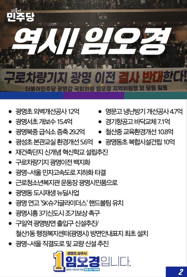 국회에서는 문화체육관광위, 첨단산업특위, 예산결산특위, 운영위, 여성가족위 등 다양한 분야에서 활동하였으며, 21대 국회 의정활동 성적 경기도1(법률소비자연맹 2024), 4년간 국정감사 우수의원 11회 수상, 4년 연속 대한민국 헌정대상 등을 수상하였습니다. 임 후보는 광명시흥선 스피돔역 (국립소방박물관) 신설 추진, 노둣돌 광명시민건강 체육센터 건립 지원, 구일역 광명방면 출입구 신설, 광명사거리역 중앙에스컬레이터 신설 추진 등 굵직한 공약들을 선보였습니다.