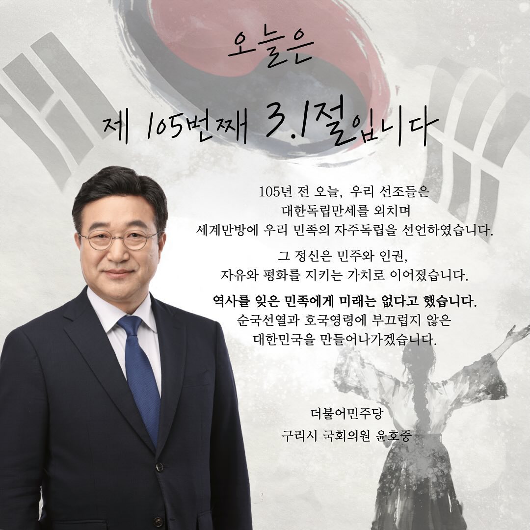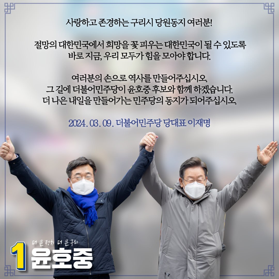 더불어민주당 윤호중 후보는 이번 선거를 무도·무능·무책임한 3무 정권 윤석열 정권을 심판하고 대한민국과 민생을 바로 세우는 선거라고 강조하였습니다. 그는 우리 모두 민주당과 함께 구국의 일념으로 온 몸을 다해 국민이 승리하는 선거를 만들어나가자고 말하였습니다. 그는 또한 반드시 승리해 더 큰 정치로 더 큰 구리, 더 큰 대한민국을 만들겠다고 목소리를 높였습니다.