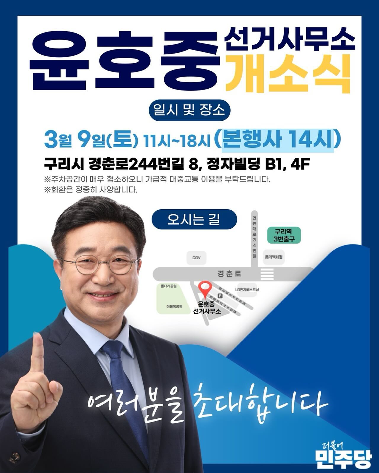 윤호중 후보는 지난 6일 별내선 구리역에서 출마기자회견을 갖고 제22대 국회의원 선거 출마를 공식 선언한 뒤 구리시 곳곳을 누비며 구리시민들과 직접 소통하고 있습니다. 그는 또한 서민·청년·여성·학부모·근로자·자영업자·중소기업도 행복한 대한민국을 만들고, 사회적 경제기본법 제정, 소득 양극화 완화를 통한 공정성장, 약자를 먼저 챙기는 복지국가, 정의와 상식이 바로 선 민주주의 국가, 주거비 완화와 임차인의 권리 향상, 골목상권 지키기 등을 주장하였습니다.