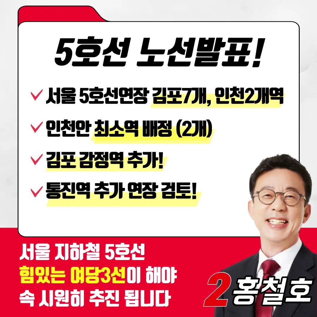 홍철호 후보는 서울지하철 5호선 연장사업에 대해 "지난 7년 5호선 김포한강선을 위해 땀 마를 새 없이 뛰어 마침내 이루어 냈다. 이제는 예타면제와 빠른 착공이 관건"이라며 "정부가 예타면제를 확정하고 제 때 사업비를 지원해서 1분 1초라도 공기를 앞당기고 빨리 개통하는 것만이 시민들께서 그동안 고생하고 수고하신 노고에 대한 보상이 될 수 있을 것"이라고 강조하였습니다.