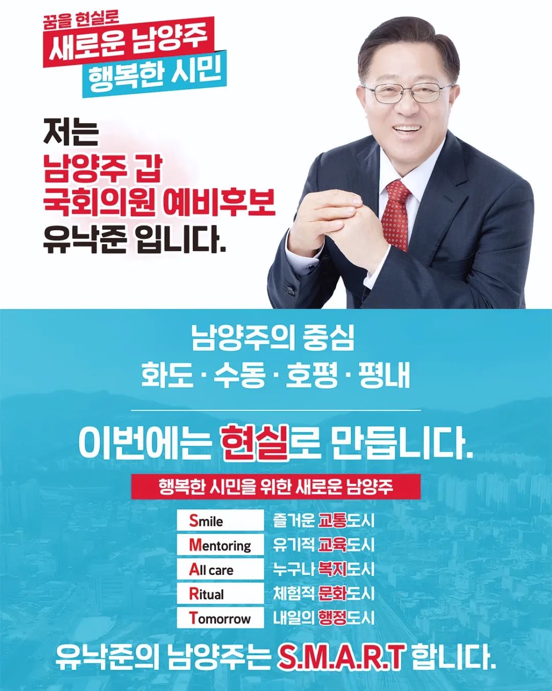 남양주시 갑 선거구는 '진보 텃밭’으로 알려져 있습니다. 2004년 17대부터 2020년 21대 총선까지 보수 정당이 승리한 적이 한 번도 없습니다. 유낙준 후보는 2024년 2월 18일, 국민의힘 경기 남양주시 갑 선거구에서 단수 공천을 받았습니다. 그는 이번 국회의원 선거를 '대한민국 청년세대의 한 사람으로서 누구보다 당당한 도덕성과 철저히 준비된 실력으로 반드시 새로운 미래를 열겠다’는 포부를 밝혔습니다.