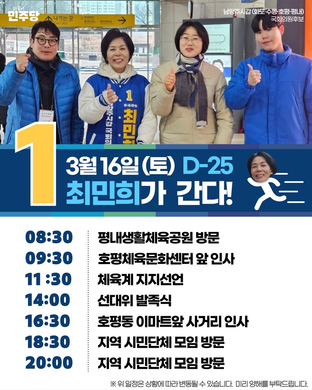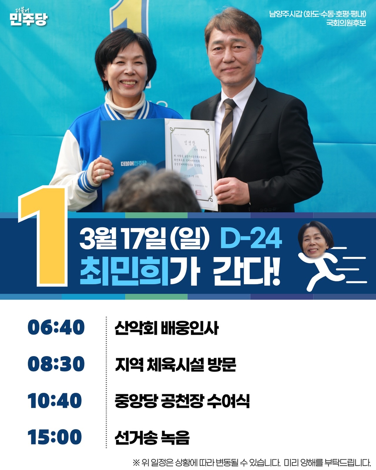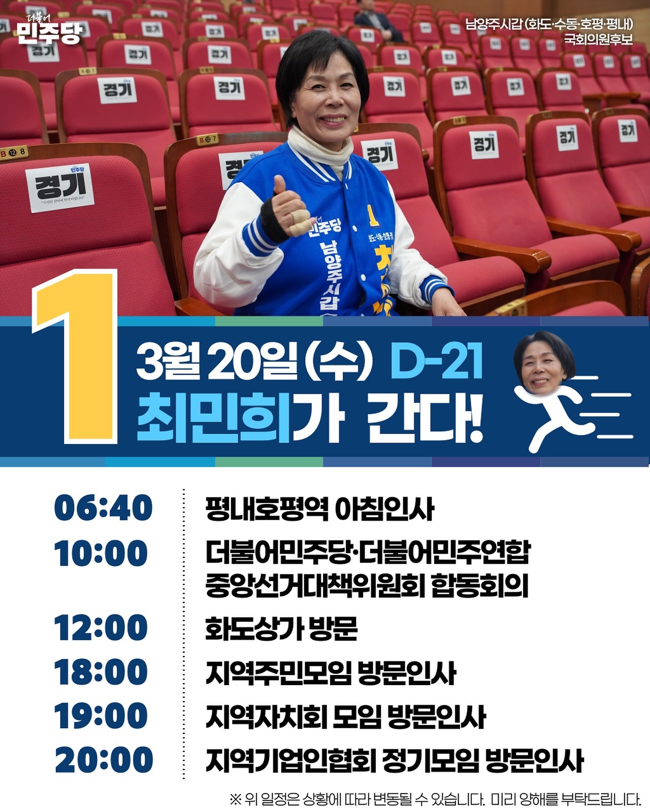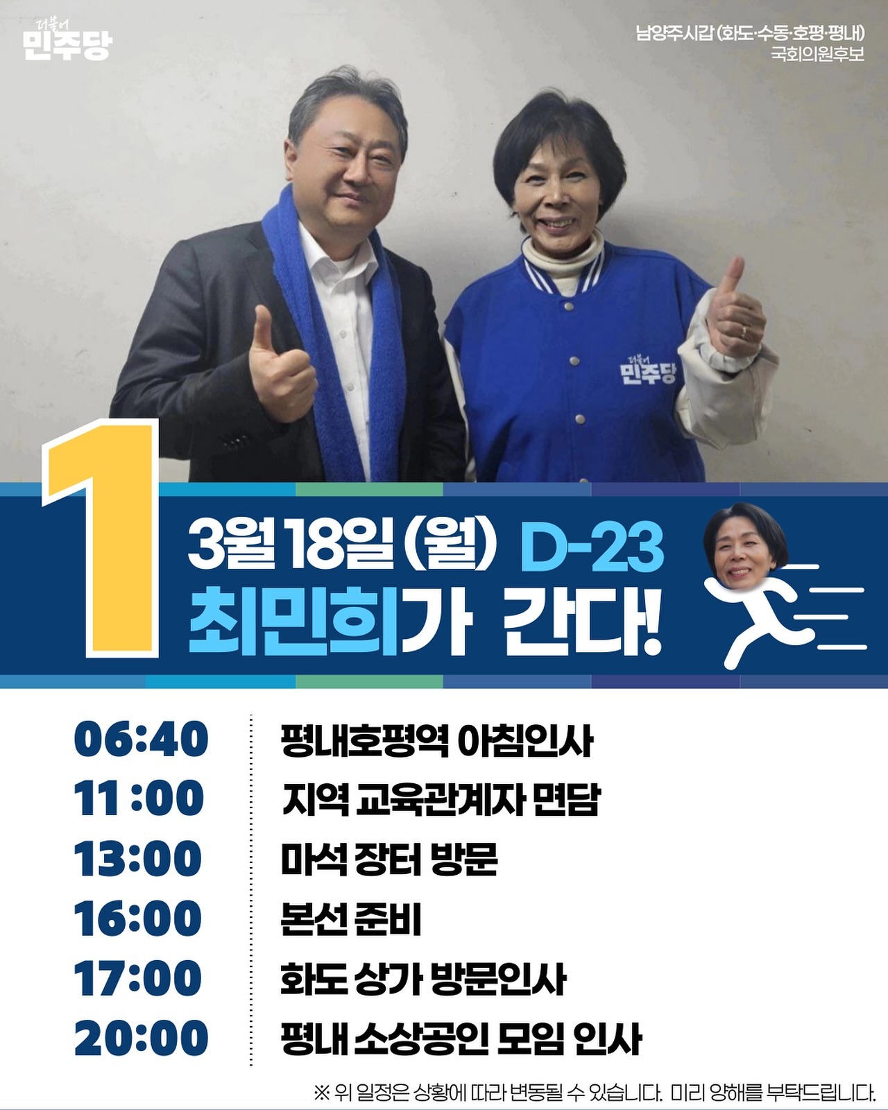 화도IC 등 상습정체 구간에 대해 교통수요를 반영한 대책을 마련해 혼잡도를 줄일 것이라고 했습니다. 스포츠 생활체육시설, 복합커뮤니티센터 등 주민의 삶의 질 향상을 위한 여가시설 확충을 위해 김동연 경기도지사, 민주당과 힘을 합쳐 추진하겠다고 밝혔습니다. 최 후보는 대통령 직속 정책기획자문위원과 국회의원 등을 역임했으며 현재 민주당 국민소통위원장과 이재명 당대표 정치테러대책위원, 가짜뉴스대응TF 단장을 맡고 있습니다.