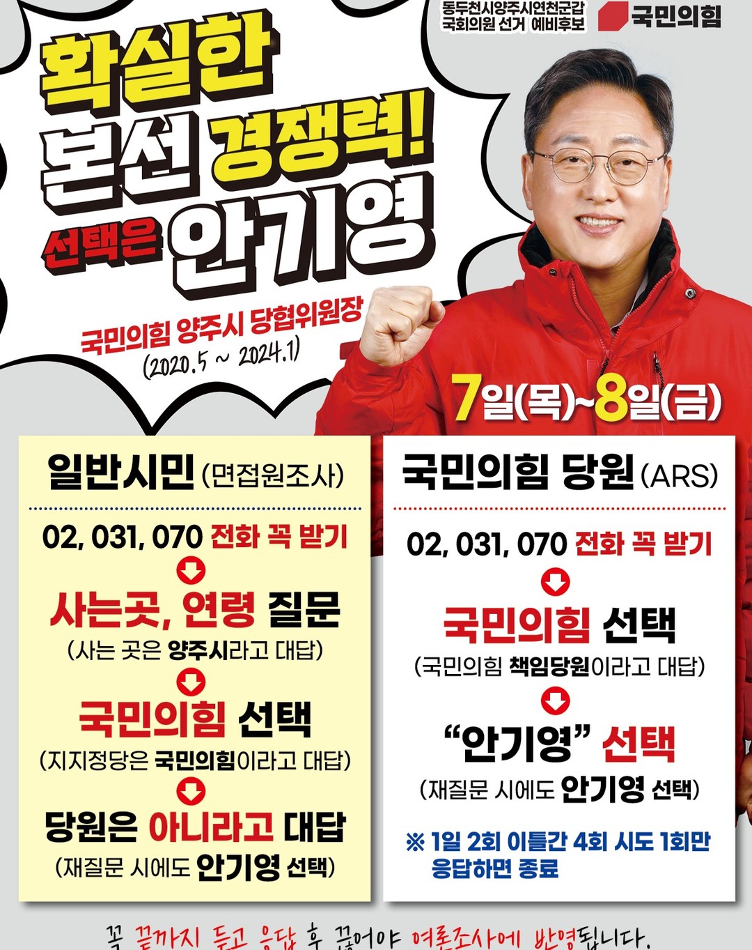 안기영 후보는 "이번 총선에서 정성호 의원을 반드시 꺾어 양주의 새로운 발전을 만들겠다"고 결의를 다졌습니다. 그는 또한 "모두가 안주할 때 ‘필사즉생’의 각오로 양주의 새 길을 열어가고 있다. 아무것도 변한 것이 없는 게 양주의 현실"이라며 "신양주 테크노밸리의 ICT클러스터 조성을 대선 공약에 반영시키고 7호선 연장 도봉산~옥정선 조기 개통과 옥정~포천선 조기 착공을 위해 전력을 다하고 있다"고 밝혔습니다