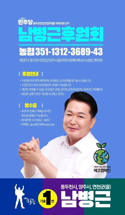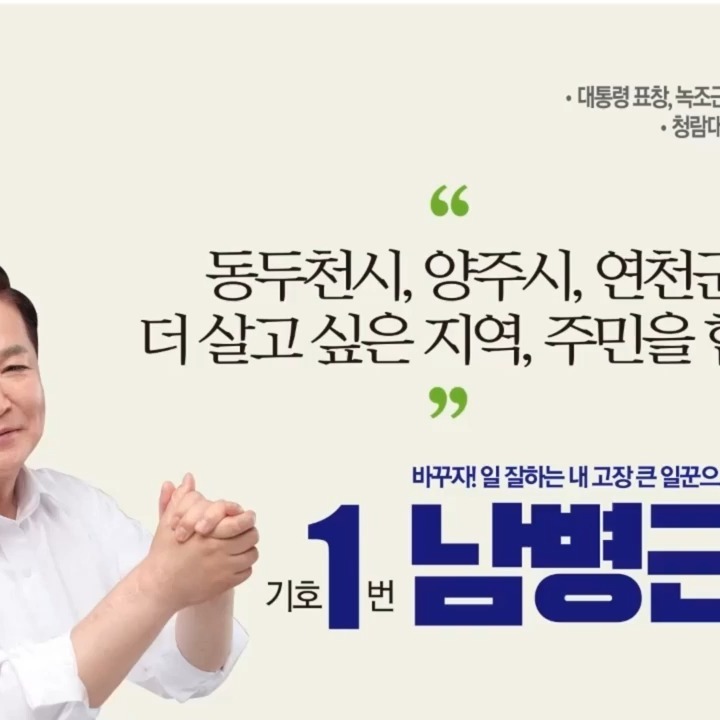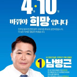 남병근 후보는 더불어민주당에서 동두천양주연천 지역을 선거구로 출마하고 있습니다. 그는 30년 이상의 공직 경력을 바탕으로 현 정권을 심판하고 지역 발전에 힘쓰겠다고 밝혔습니다. 우선 규제 개선을 통한 지역 발전을 위하여 경기 북부 발전을 막아온 규제를 개선하고, 군부대 주둔으로 인한 손실 보상을 추진할 것입니다. 또한, 70년간 미군 기지 주둔으로 인해 경제가 낙후된 동두천·연천·양주 지역을 발전시키기 위해 정부 지원을 이끌어내겠습니다고 약속하였으며 연천까지 GTX-C노선을 확장하고 첨단 대기업을 유치하여 경제 활성화를 도모하였습니다. 남병근 후보는 고향에 대한 애정과 업무 노하우를 바탕으로 공약을 이행하겠다고 자신감을 보이고 있습니다. 이번 선거에서는 남병근 후보와 국민의힘 김성원 후보가 맞대결을 펼칠 예정입니다.