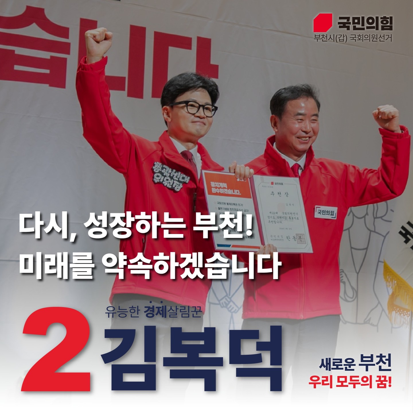 김복덕 후보는 국민의힘 소속으로서 보수적 가치와 정책을 지향합니다. 그는 기업인 출신으로, 36년 전에 부천시에 위치한 중소기업에 입사하여 창업 후 상장기업까지 이끌었습니다. 그의 정치적 입장과 비전은 더 넓은 지역에서 실현될 수 있는 기회를 제공하며, 그는 지역사회 발전, 국가 경제 성장, 그리고 국민의 삶의 질 향상을 위해 끊임없이 노력할 것임을 약속하고 있습니다.