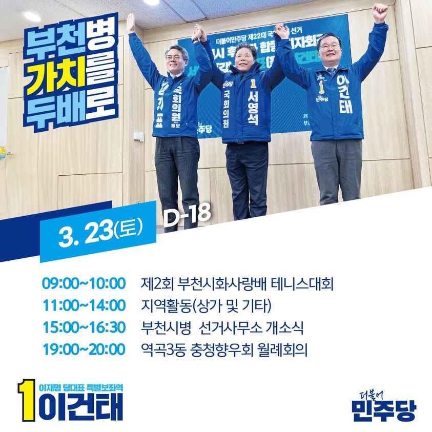 더불어민주당 국회의원 후보 이건태는 "그동안 지역발전 정체의 이유가 정치력의 부재’, '중앙정치권과 약한 네트워킹이 주된 문제"라며, "당대표 특별보좌역이란 강한 자신의 정치적 장점을 통해 소사의 발전을 꾀하겠다"고 말하였습니다. 그는 또한 "경제 폭망, 민생 파탄, 민주주의 후퇴 등 세계 모든 정부와 시민들이 대한민국의 상황을 걱정스럽게 진단하고 있다"고 주장하였습니다.