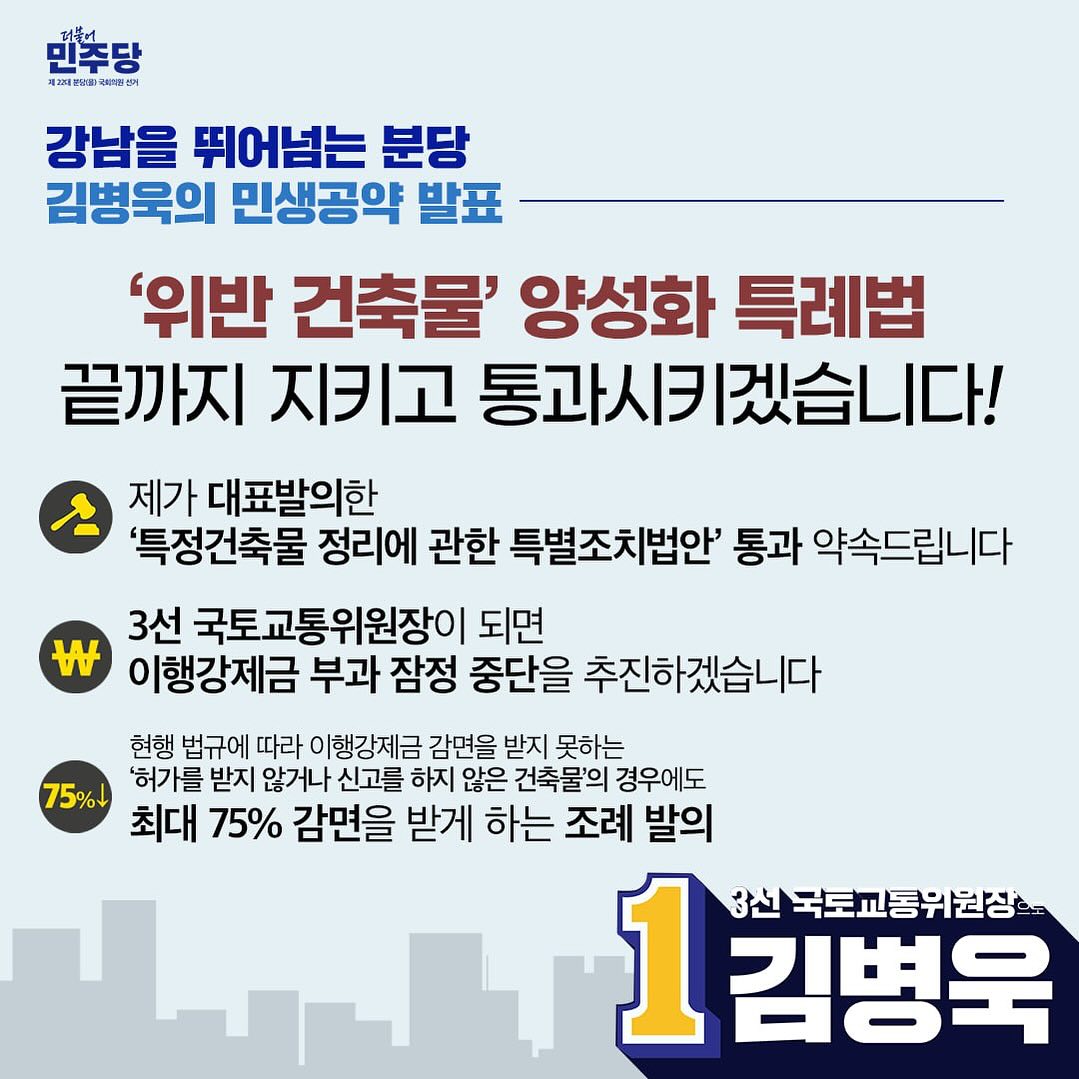 진정한 대의민주주의에서는 이러한 양보와 타협이 필수적인 요소라고 생각하며, 이를 통해 사회적 비용을 줄이고 더 나은 민생으로 이어질 수 있다고 믿습니다. 그는 신도시 재건축 특별법이 통과된 후, 이번에 3선이 되면 국회 국토교통위원장을 해서 법이 현장에 잘 안착할 수 있도록 추후 법과 시행령을 잘 만들어 보겠다고 밝혔습니다. 이는 그의 정치적 입장을 잘 보여주는 예시로, 국민의 삶을 개선하기 위한 구체적인 정책을 제시하고 이를 실현하기 위해 노력하는 모습을 보여줍니다