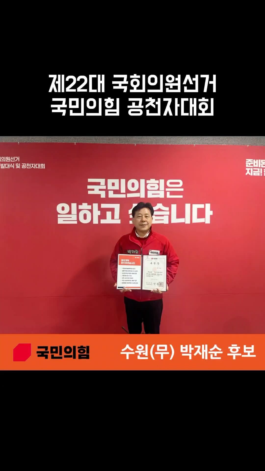 박재순 후보는 국민의힘 수원시무 지역에서 활동하고 있으며, 그의 공천은 2024년 3월 9일에 확정되었습니다. 박 후보는 지역 주민들과 당원들의 지지를 받아 국민의힘의 수원 탈환을 이끌 것을 약속하였습니다. 그는 "지역 주민들과 당원들의 잃어버린 12년 심판하라는 준엄한 명령"에 따라 승리하고 지역 숙원사업을 해결할 것을 강조하였습니다.