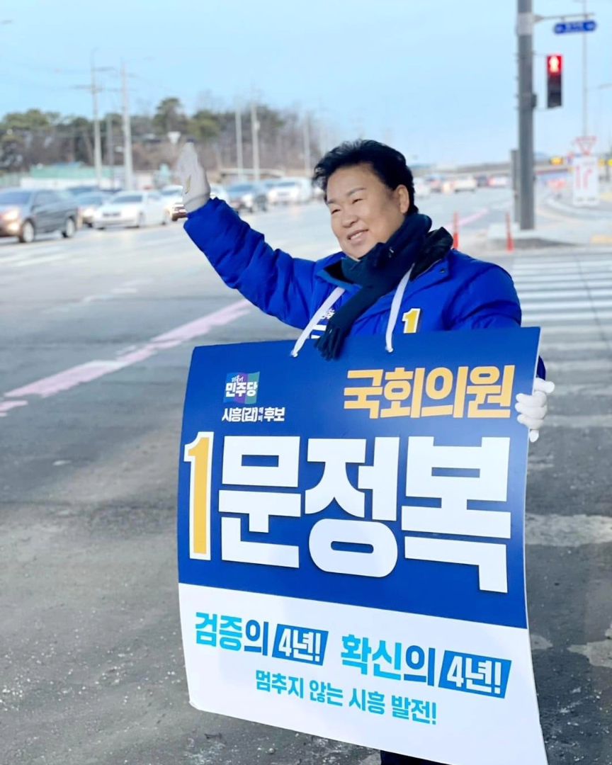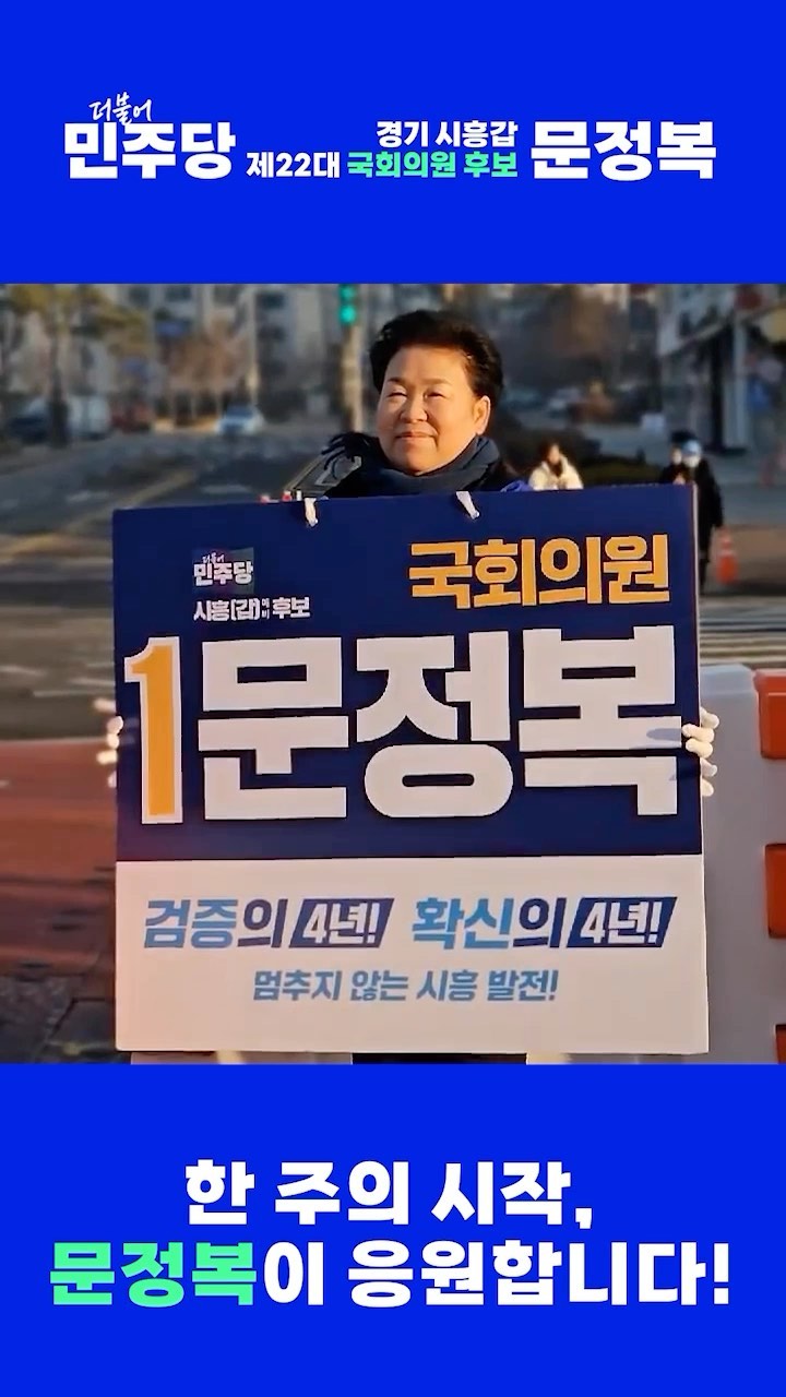 문정복 후보는 경기도 시흥시 갑 지역구에서 더불어민주당 국회의원 후보로 활동하고 있습니다. 그녀는 지난 19일 출마선언 후 '검증의 4, 확신의 4, 멈추지 않는 시흥 발전을 슬로건으로 제시하였습니다. 그녀의 선거사무소 개소식에는 사회 각계인사와 지역 주민, 지지자 500여명이 참석하였으며, 이날 행사는 선거사무소 개소식과 선거대책위원회 출범식으로 진행되었습니다.