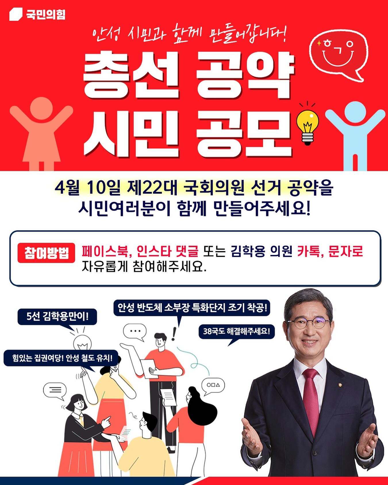 김학용 후보는 "안성에 국가 반도체 소부장 특화단지를 직접 유치한 실력으로 반도체를 시작으로 철도까지 확실히 책임지겠다"집권 여당 5선 의원의 힘과 열정으로 안성 발전이라는 시민의 꿈을 반드시 현실로 만들겠다고밝혔습니다. 민생 중심의 정치: 그는 "마음은 처음처럼 능력은 4선답게.더 낮게 더 가까이 시민께 다가가겠습니다"라는 슬로건 아래 표밭갈이에 나섰습니다. 그는 초선 때처럼 낮은 자세로 유권자에게 다가간 것이 승리의 원동력이 됐다고 자평하였습니다 교통 인프라 개선: 김학용 후보는 안성시의 교통 인프라 개선을 위해 광역급행전철 GTX-A 안성역 종점 연장, 평택-안성-부발선 철도의 조기 착공 등을 공약하였습니다