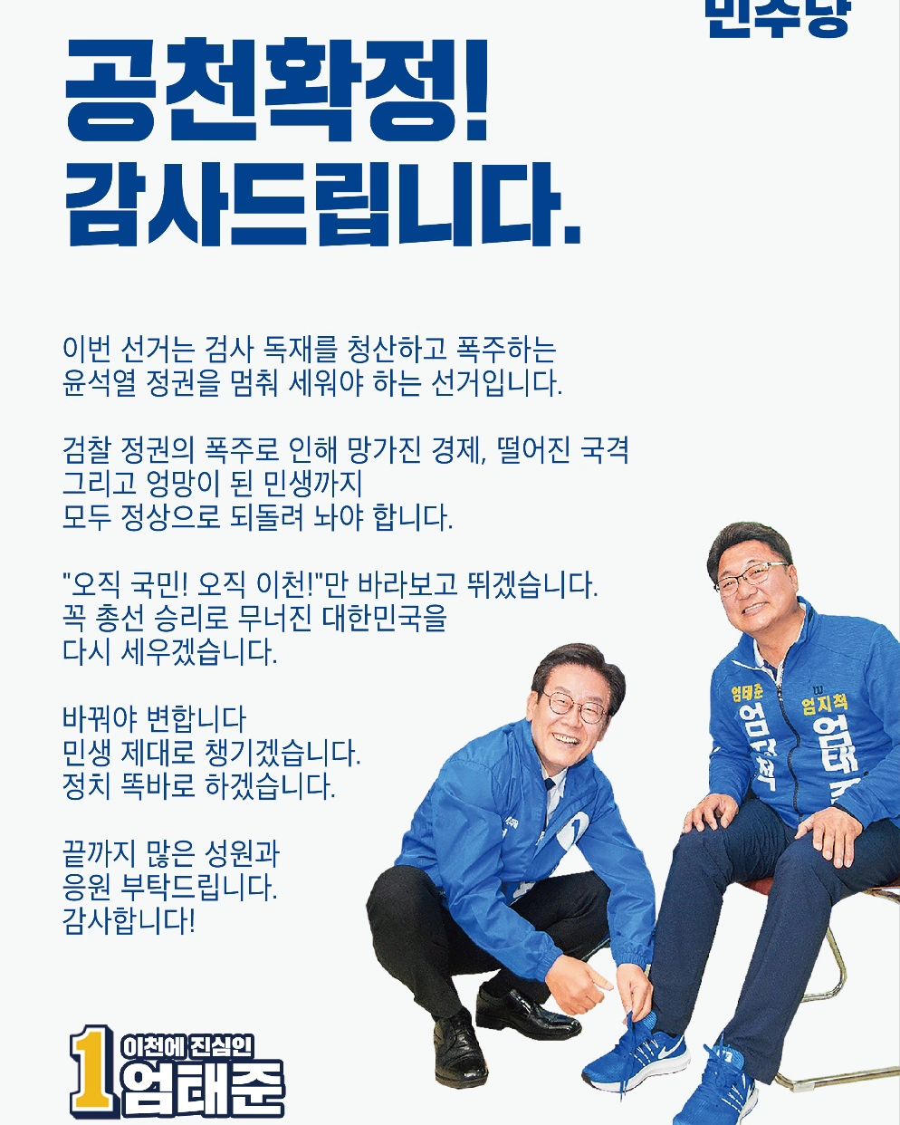 아울러 엄태준 후보는 이천의 묵은 숙제인 중첩규제 해결을 강조하였습니다53. 그는 각종 제약에 대해 인정할 것은 인정하되 특별한 희생에 따른 특별한 지원책을 반드시 만들어 낼 것이라고 말하였습니다. 이천시장 재임 당시 코로나19 대응으로 2차 재난지원금을 이천시 자체적으로 지급해 지역민들의 좋은 반응을 얻기도 했습니다4. 이천시민의 믿음과 적극적인 성원에 힘입어 재선의원이 됐고 그 명을 받들어 이천발전을 위해 주야불문 의정활동에 매진하고 있다고 강조하였습니다