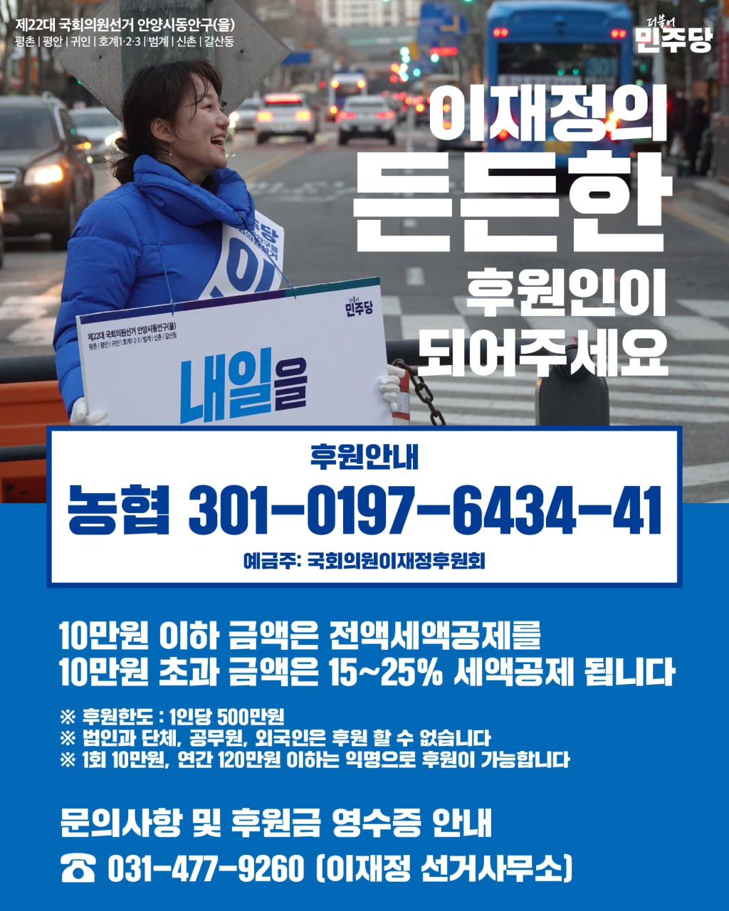그러나 이에 대해 심재철 전 의원은 이재정 의원이 유권자들을 기망하고 있다며 이를 반박하였습니다. 이재정 의원은 또한 더불어민주당 공천관리위원직 사퇴 의사를 밝혔습니다. 이재정 의원은 안양 동안구을 지역구에서 더 좋은 안양, 더 좋은 대한민국을 만들기 위한 도전을 시작하겠다고 약속하였습니다. 그는 1기 신도시 특별법을 통해 1기 신도시 제일의 도시 안양을 만들고 상권 활성화와 기업유치를 골자로 한 경제 발전, 도시브랜드 변화를 위한 동안구의 명칭 변경 (평촌구) 등을 이뤄나가겠다고 공약하였습니다.