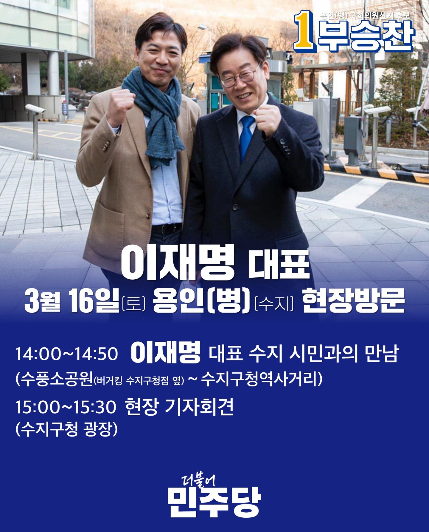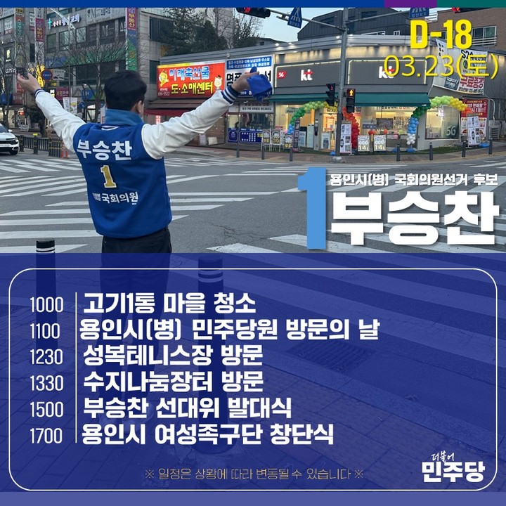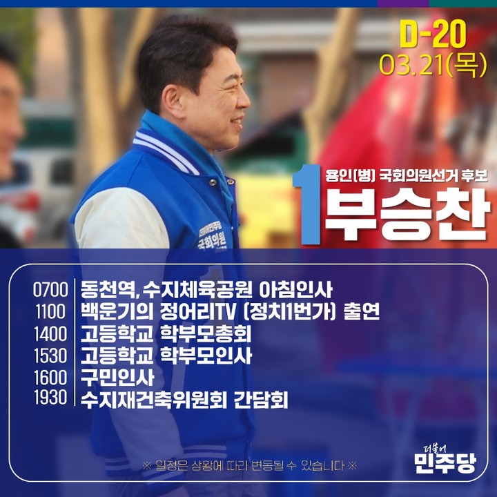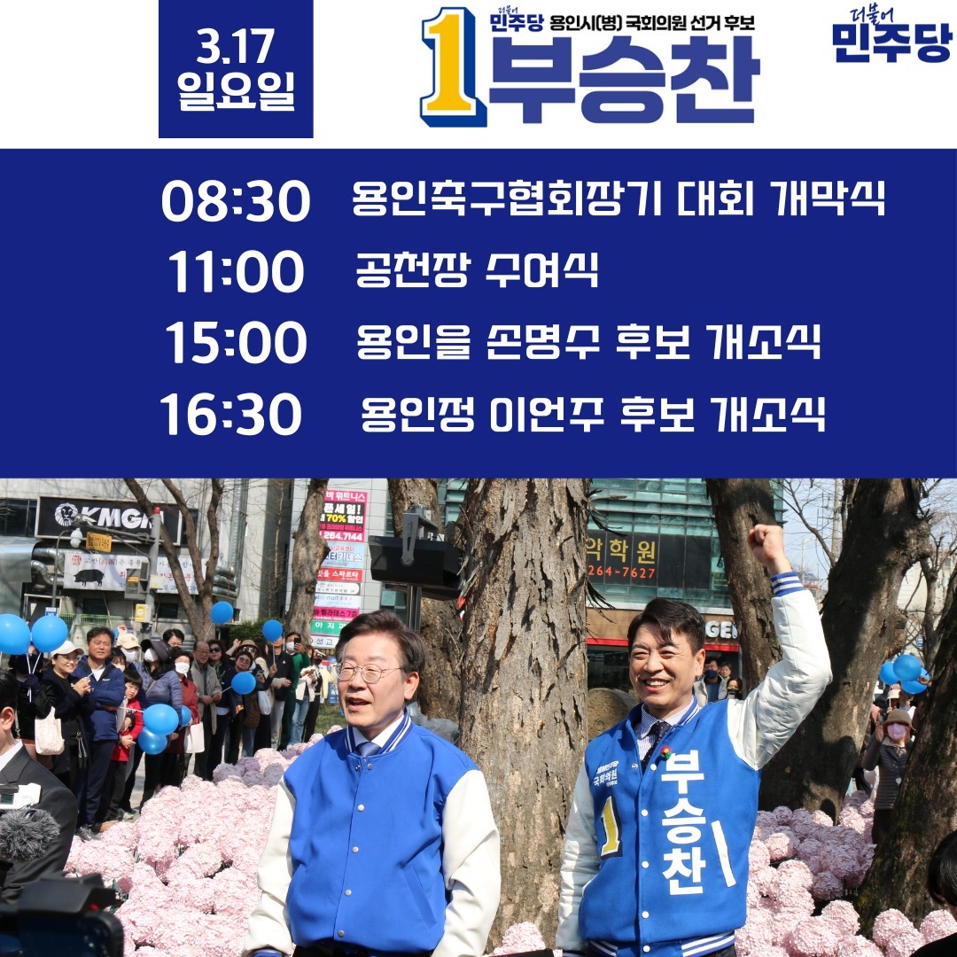 부승찬 후보는 이재명 대표의 대통령 선거 경선캠프에서 제주지역 관리자로 활동했고 각종 방송에서 윤 대통령을 비판하면서 이 대표를 치켜세우는 등의 행보로 이재명 대표의 지지자들 사이에서 입지를 굳혀갔다. 그는 지난해 10월17일 페이스북에서 “민주당 개혁과 혁신을 이뤄내는 데 앞장서겠다. 시작은 사익에 눈 먼 의원들을 교체하는 것이 수지를 선택한 이유”라며 출마를 공식화했다. 이러한 활동을 통해 부승찬 후보는 지역구의 정치적 상황에 큰 영향을 미치고 있습니다.