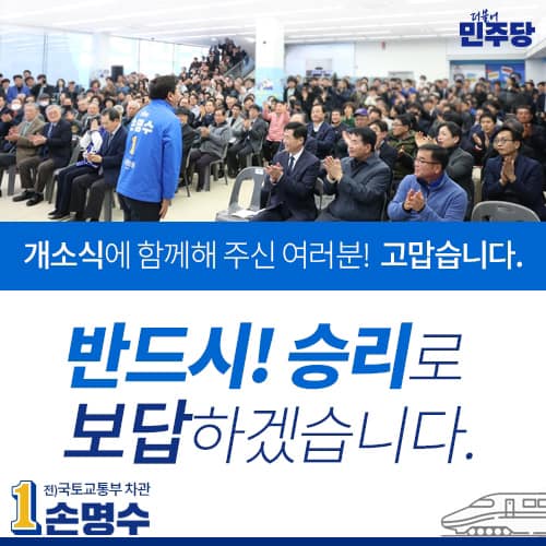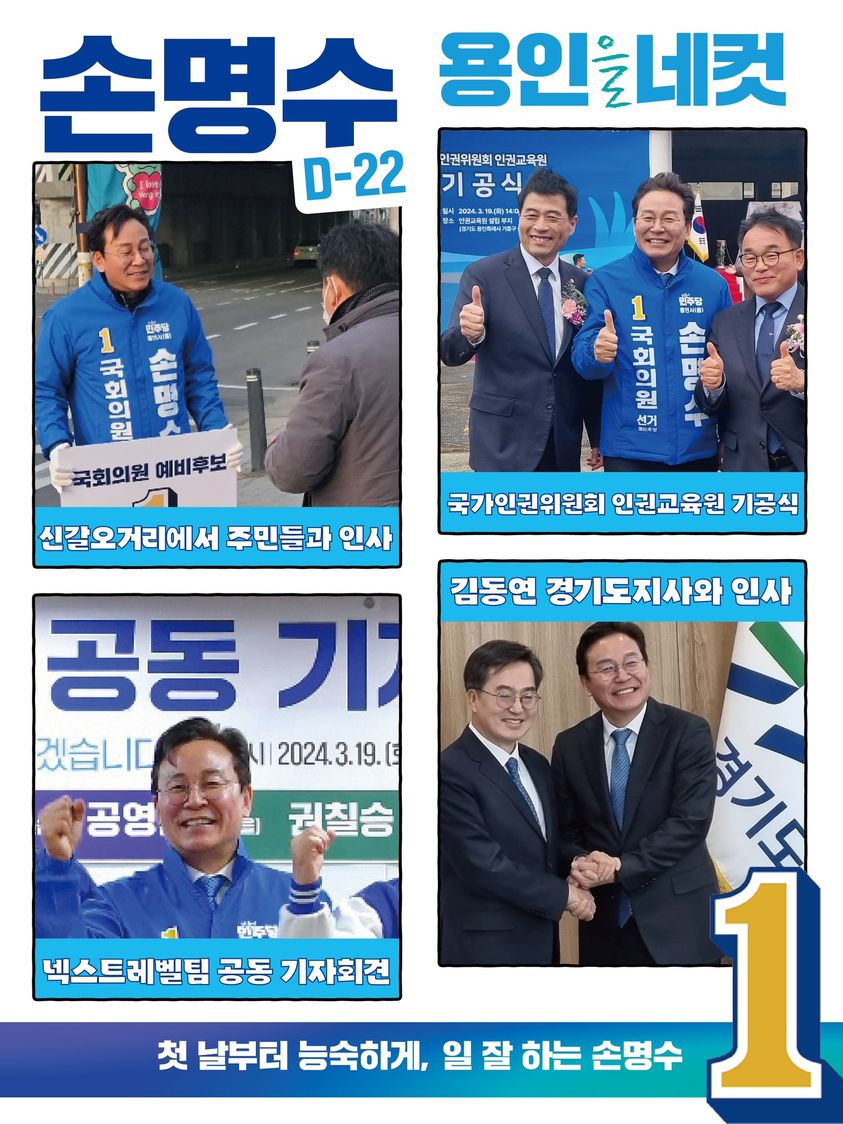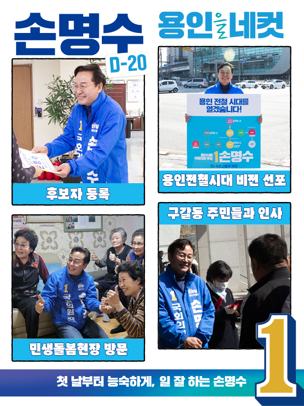 손 후보는 선거운동에서 "30여년 간 국토교통부에서 쌓은 경험을 살려 용인시민이 철도를 통해 서울은 물론 전국 어디든 편리하고 빠르게 이동할 수 있도록 '용인전철시대’를 열겠다"며 교통, 문화, 체육, 복지, 교육 등 분야별 비전을 발표하였습니다. 또한 "다가오는 4월 총선은 너무나 중요하다"며 "더불어민주당과 함께 4월 총선에서 반드시 승리해 무너진 국격을 회복하고, 민주주의를 회복하겠다"고 강조하였습니다