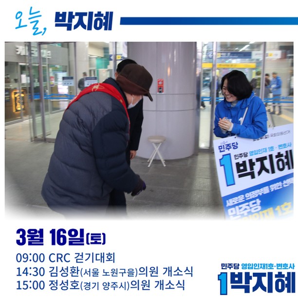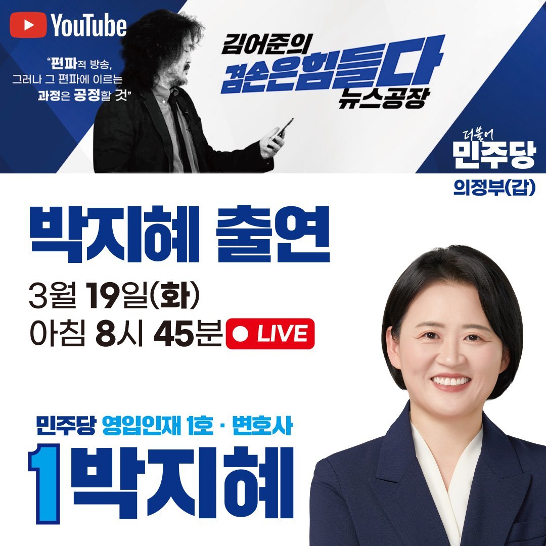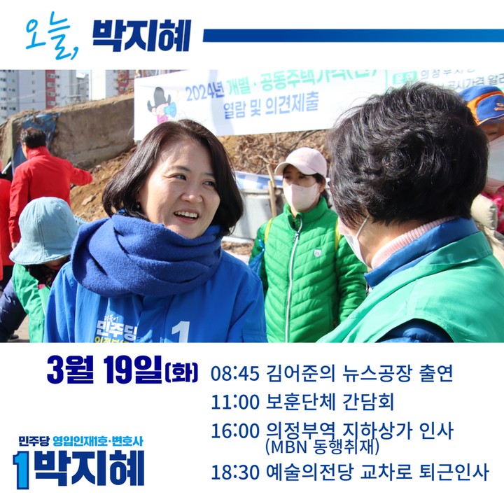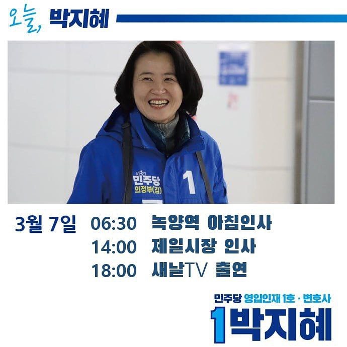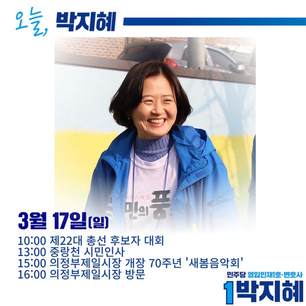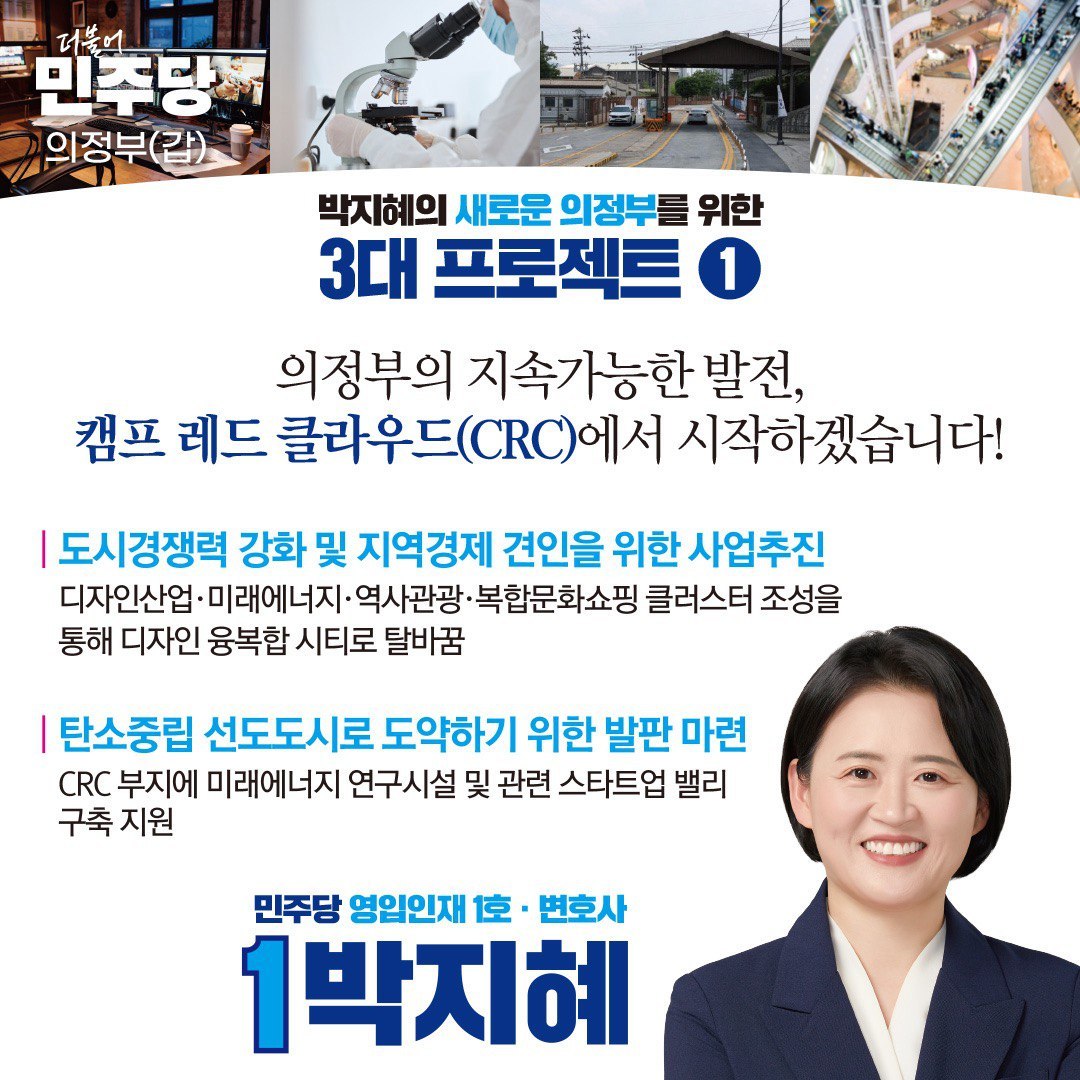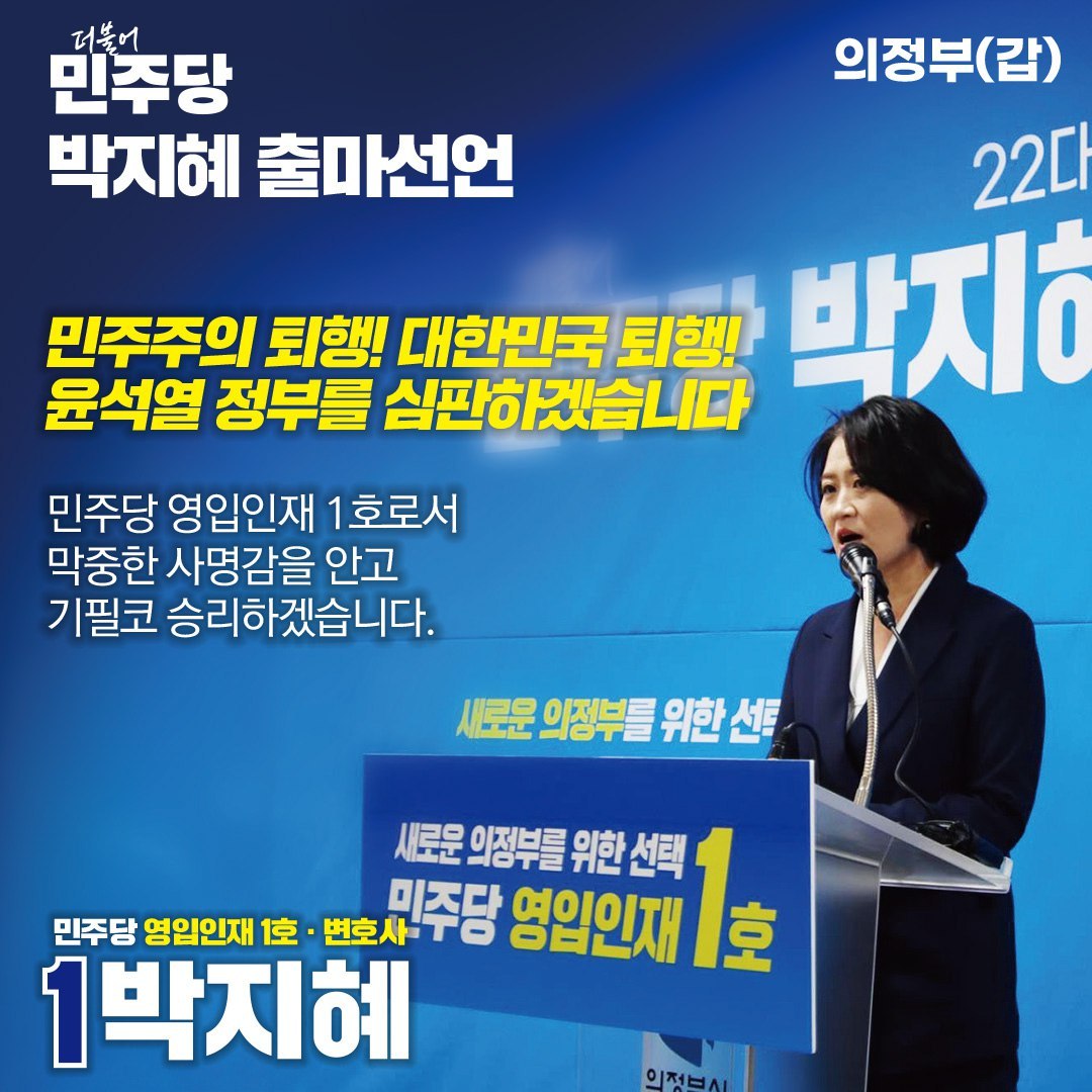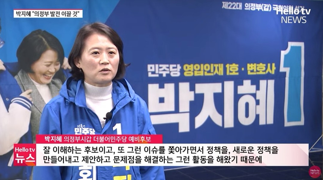 박지혜 후보는 경기 의정부갑 지역구에서 더불어민주당 후보로 선출되었으며. 최근 여론조사 결과에 따르면, 박지혜 후보는 국민의힘 후보 전희경 후보와 오차범위내에서 치열한 접전을 벌이는 것으로 나타나 있습니다. 박지혜 후보는 환경 전문 변호사로서, 비영리법인 기후솔루션 이사와 에너지전환포럼 감사를 역임하였습니다.