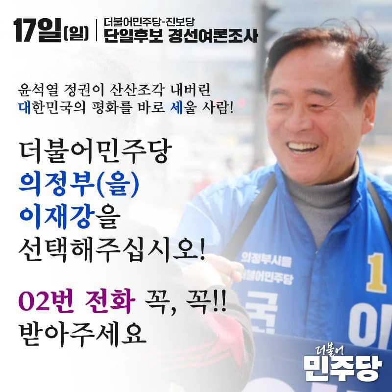더불어민주당 의정부을 지역에서 이재강 후보는 8~9일 양일간 국민경선을 통해 제22대 총선 후보로 확정되었습니다. 이 후보는 이재명 경기도지사 재임시 경기도 평화부지사, 1대 경기도 국제평화교류위원회 공동위원장을 역임한 이재명계로 분류됩니다. 현재 더불어민주당 기본사회위원회 부위원장으로 활동하고 있습니다.