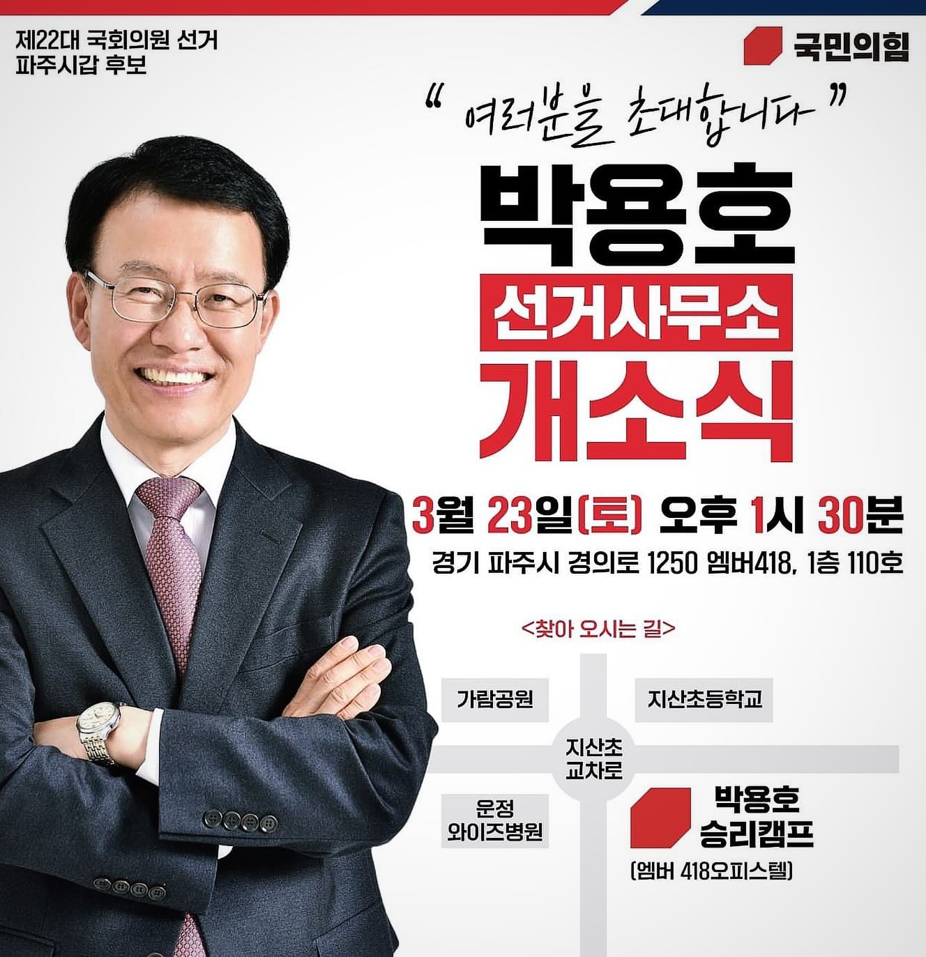 또한 중앙부처 국무조정실 규제심판위원으로 활동하며 기업 성장에 발목을 잡는 법안들을 찾고, 기업인들과의 소통으로 규제를 발굴하여, 해당 규제를 혁신하는 활동도 해왔습니다. 박용호 후보는 "오직 파주발전을 위해 일할 줄 아는 여당의 후보가 필요한 파주임을 큰 책임감으로 인식하고, 중앙당의 요청을 겸허히 받아들여 사즉생의 각오로 임해 필승하겠다"고 밝혔습니다. 그는 이어 "운정과 교하 신도시에서 그동안 교통 문제, 일자리 문제, 교육 환경 등의 개선·발전이 매우 미흡했다"면서 "일할 줄 아는 여당, 국민의힘 일꾼 입장에서 이번 총선을 통해 ‘3·광·일·교’ (3호선, 광역버스, 일자리, 교육)로 혁신하는 신도시를 만들겠다"는 각오를 밝혔습니다.