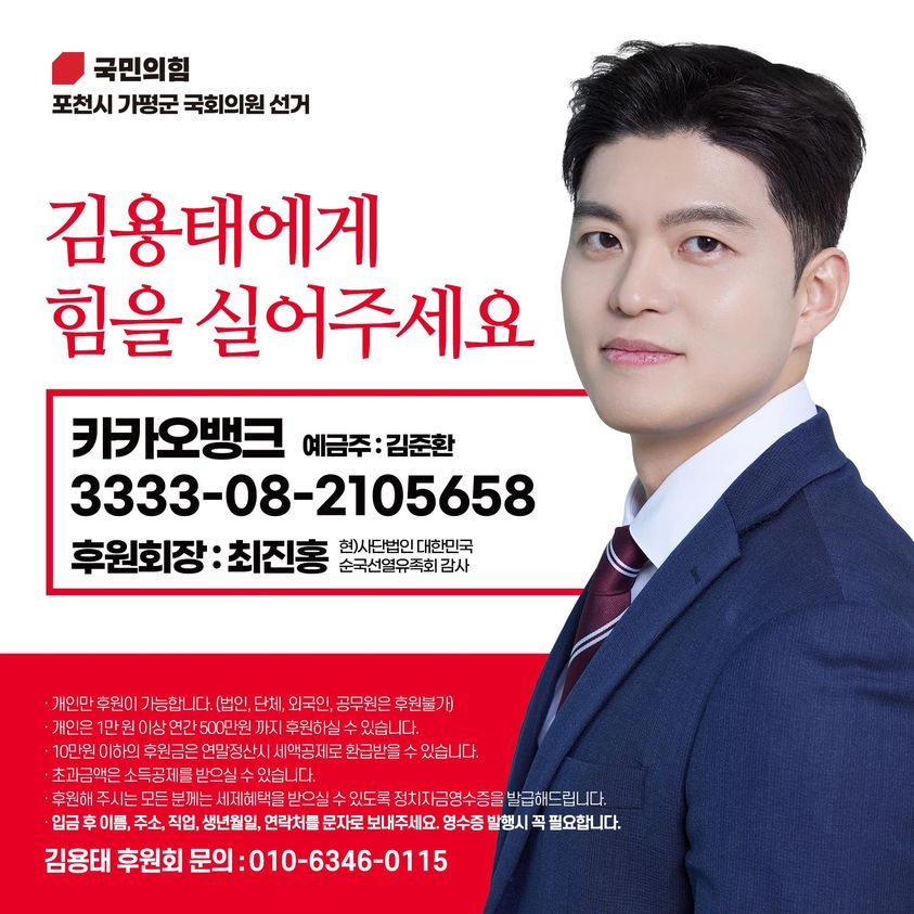 김용태 후보는 경기도 포천시 가평군 지역구에서 국민의힘 소속으로 국회의원에 출마합니다. 그는 1990년생으로 고려대학교 그린스쿨대학원에서 에너지환경정책학 석사 학위를 취득했습니다. 김 후보는 국민의힘 청년최고위원을 역임했으며, 윤석열 대통령직 인수위원회 자문위원으로도 활동했습니다. 또한, ROTC 52기로 임관하여 육군 23사단에서 중위로 예편한 군 경력도 가지고 있습니다. 그는 포천과 가평 지역의 발전을 위해 '지역소멸 극복’과 '모범적인 다문화도시 조성’을 주요 공약으로 내세우고 있습니다.