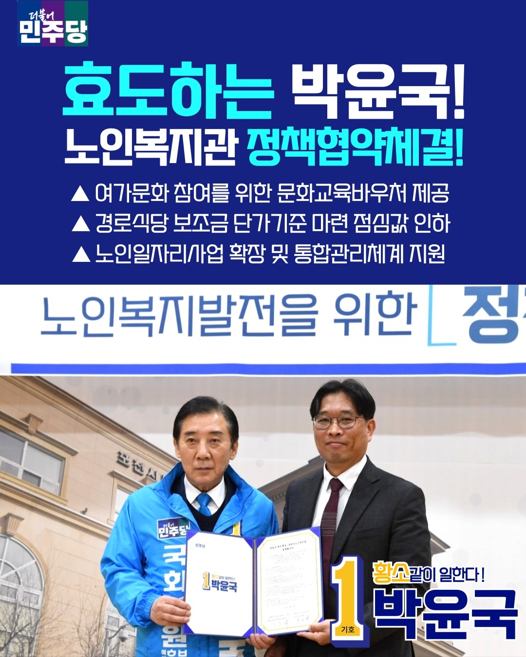경기북부특별자치도 설치 지지: 박윤국 후보는 경기북부특별자치도 설치를 적극 지지하며, 도지사의 정책을 뒷받침하여 입법 활동을 적극 협력할 것입니다. 박 후보는 또한 노인들의 복지시설과 서비스 개선을 중요하게 여기고 있습니다. 어르신들의 여가문화활동 참여를 위한 문화교육바우처 제공, 어르신들의 점심값 안정을 위한 경로식당 보조금 단가기준 마련 등을 추진할 계획입니다. 이렇듯 박윤국 후보는 지역과 시민들을 위해 실용주의 정치로 노력하며, 민생을 최우선으로 하는 정치인으로서 활동하고 있습니다.