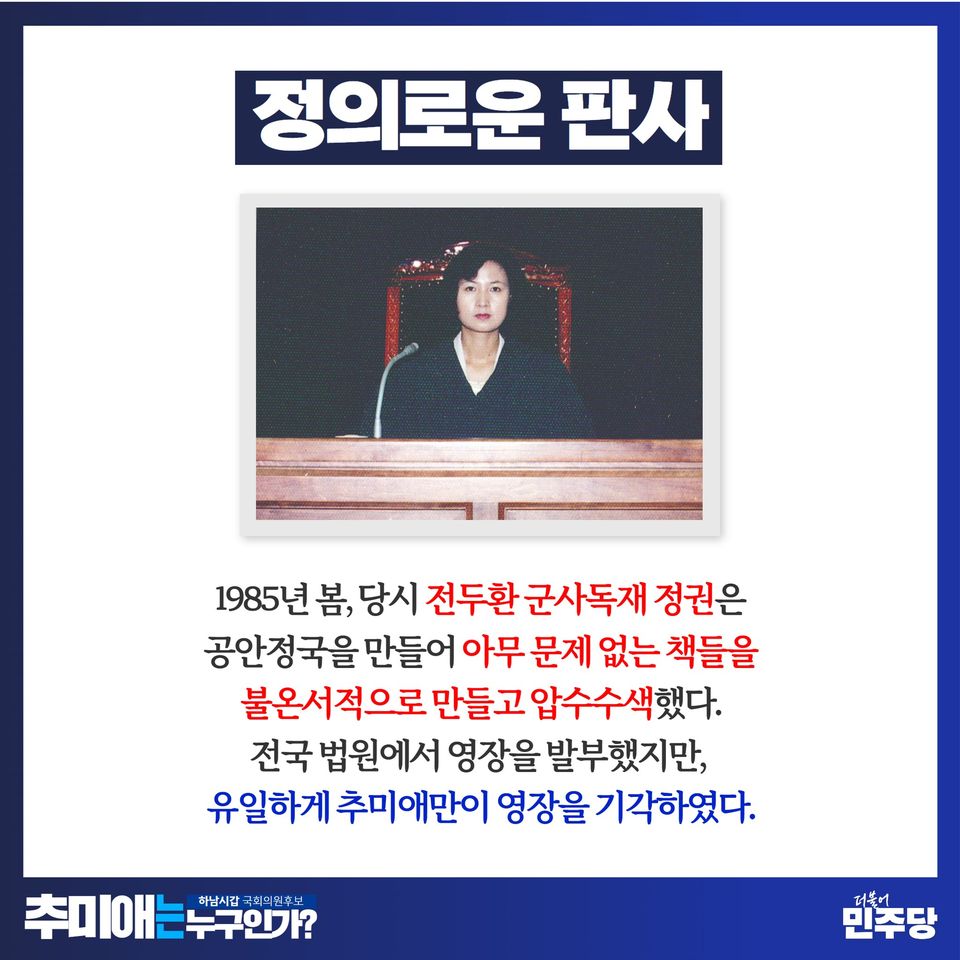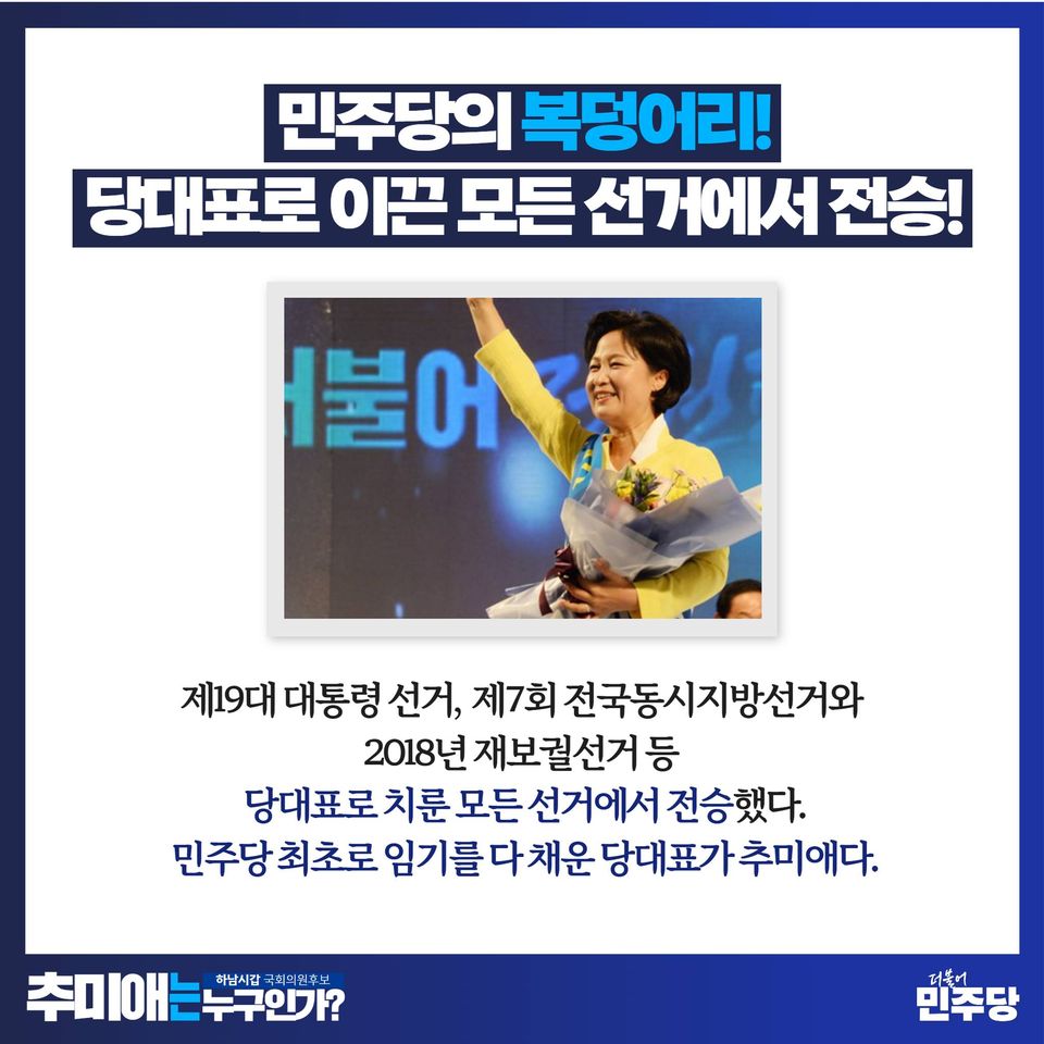 추미애 후보는 또한 더불어민주당의 중요한 정치적 입장을 대표하고 있습니다. 그녀는 더불어민주당의 핵심 가치와 원칙을 고수하며, 민주주의와 사회정의를 위해 노력하고 있습니다. 이러한 활동은 그녀가 더불어민주당의 중요한 리더로서의 역할을 수행하고 있음을 보여줍니다.