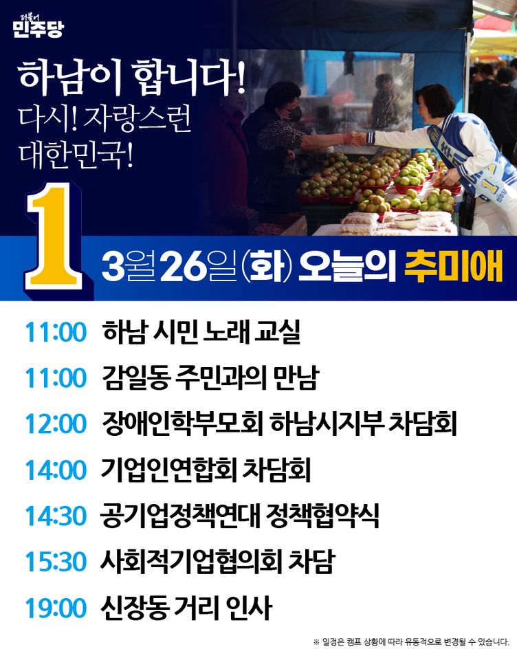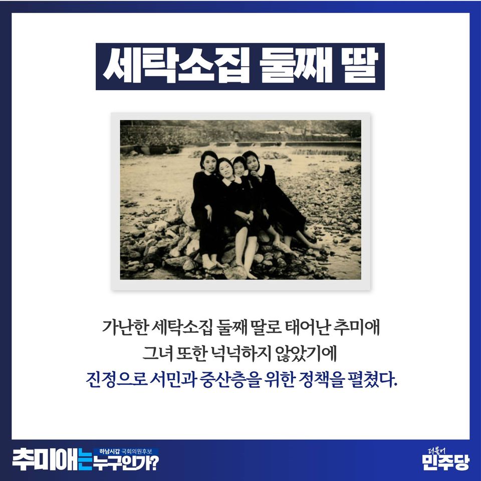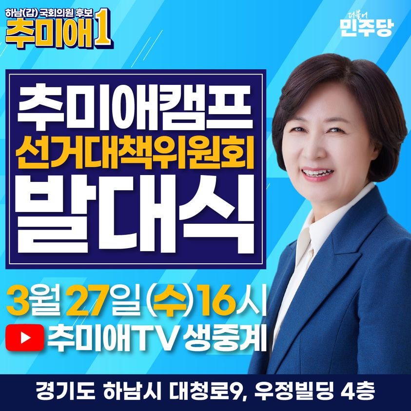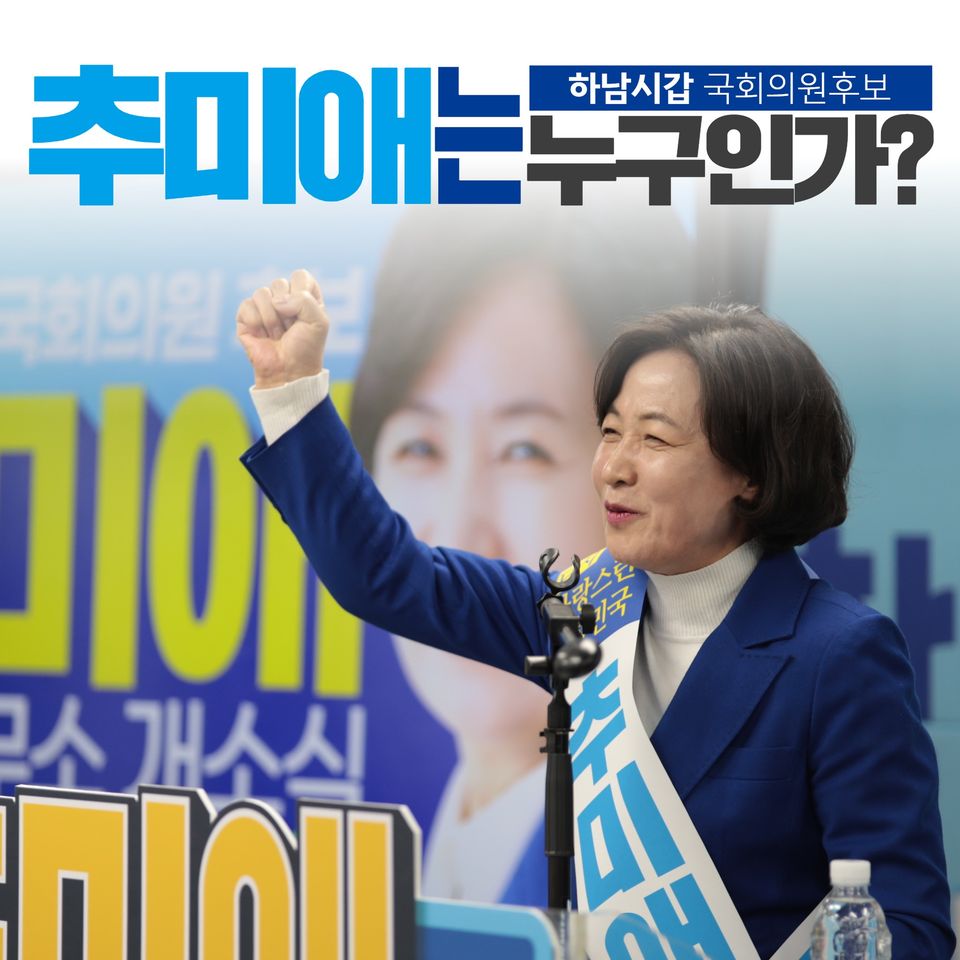 더불어민주당 국회의원 후보 추미애는 "서민의 삶을 구해내는 것이 제 정치의 목표이고, 민주주의를 구하는 것이 저 추미애의 목표다"라고 강조하였습니다1. 그녀는 또한 "나라가 위기이고 민주주의가 도탄에 빠질 때 추미애가 더 정열적으로 뛰었듯이 제가 나라를 구해내고 광진구 발전처럼 이 하남도 발전시킬 것을 여러분께 확실하게 말씀드릴 수 있다"고 약속하였습니다.