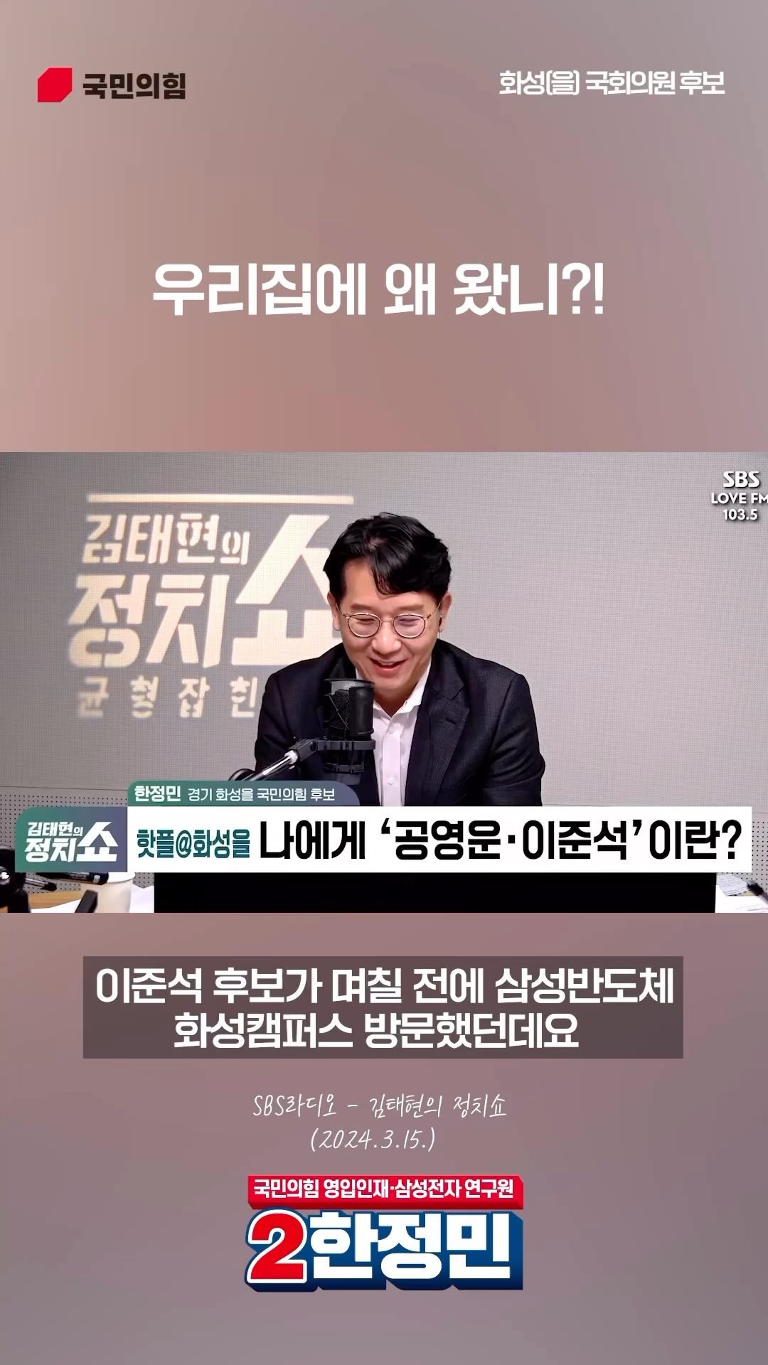 한정민 후보는 "전문성을 가진 제가 정치 영역으로 이동해 기업과의 협력으로 국가 경쟁력을 확보하고 지역을 발전시켜야겠다는 결심을 했다"고 밝혔습니다1. 그는 "한국형 반도체 지원 패키지 법안을 추진하고 지역적으로는 국제학교와 반도체 고등학교를 설립해 반도체 인재들을 양성해야 한다"고 주장하였습니다. 또한, 그는 동탄에서 10년 동안 생활하면서 지역의 문제점을 체감하였고, 이를 바탕으로 교통 인프라 개선과 교육 인프라 확충을 주장하고 있습니다1. 그는 "동탄은 증가한 인구에 비해 교통 인프라가 부족하다"며, 분당선을 동탄으로 연장하고, 동탄~부발선을 추진하겠다고 밝혔습니다. 또한, "교육 인프라도 부족하다. 과밀학급 문제가 매우 심각한데, 인구수 증감에 따라 학교를 신설할 수 있도록 하는 제도가 시급하다"고 주장하였습니다. 이러한 입장을 통해 한정민 후보는 그의 전문성과 지역에 대한 이해를 바탕으로 반도체 산업의 경쟁력 강화와 지역 문제 해결을 위한 정책을 주장하고 있음을 보여줍니다.