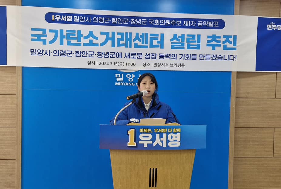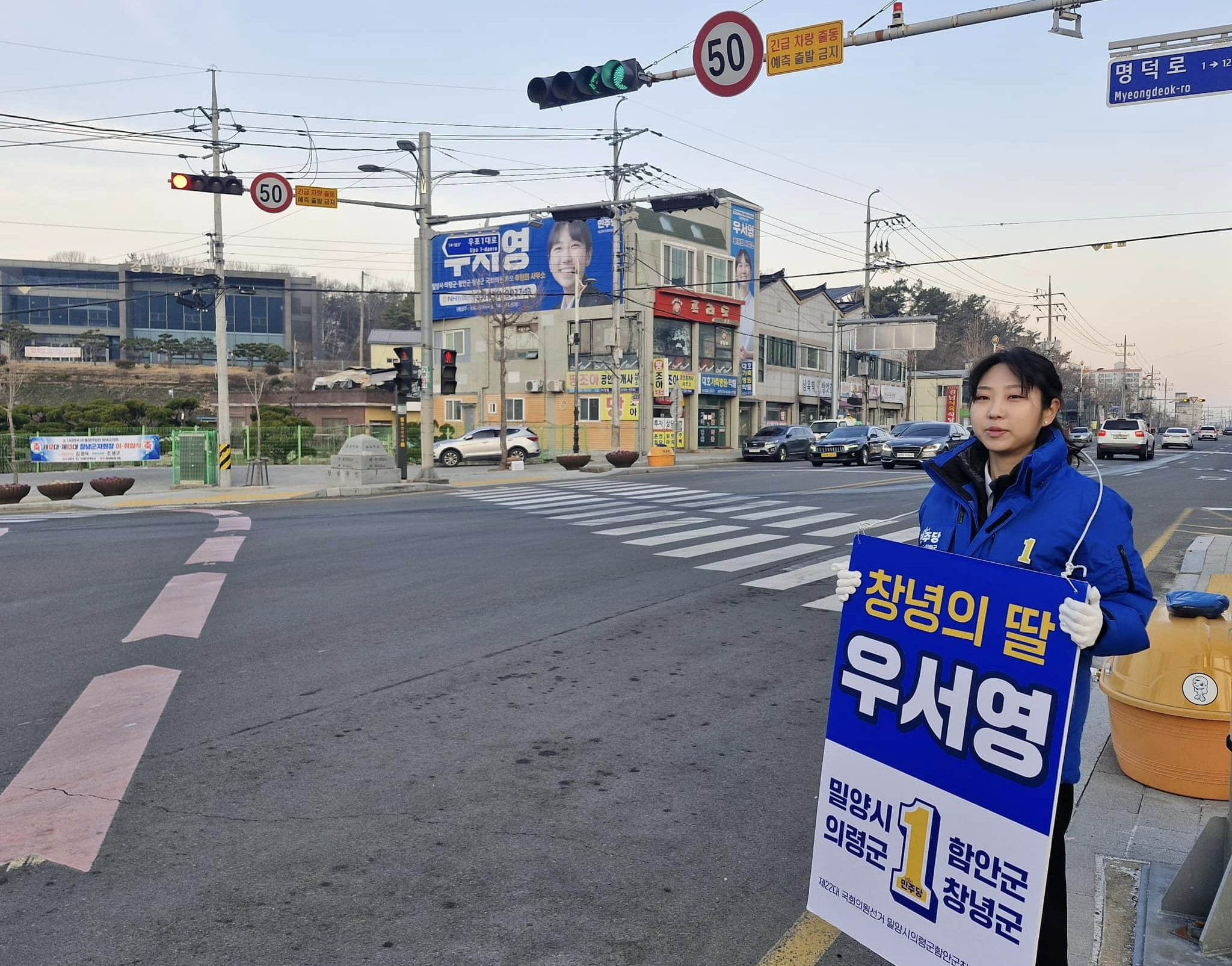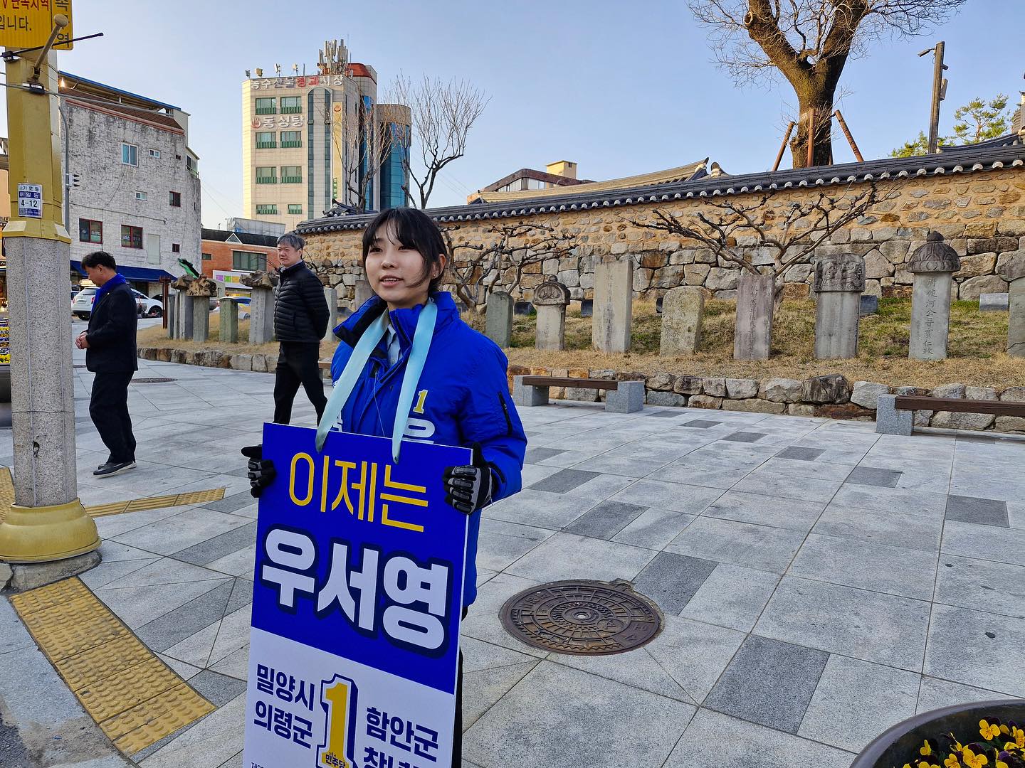 우서영 후보는 경남 밀양·의령·함안·창녕 지역구에서 더불어민주당 국회의원 후보로 출마하였습니다. 이 지역은 전통적으로 보수 정당의 강세 지역으로 알려져 있으며, 국민의힘 소속의 조해진 의원이 현역으로 있습니다1. 우서영 후보는 28세의 젊은 여성 정치인으로, 지역구 내에서 변화와 새로운 도전을 강조하며 선거 운동을 펼치고 있습니다. 우서영 후보는 선거사무소 개소식을 통해 본격적인 선거 운동을 시작하였고, 이재명 더불어민주당 대표와 여러 국회의원들의 지지를 받으며 필승 의지를 다졌습니다.