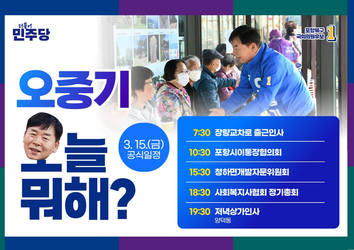 더불어민주당의 오중기 후보는 포항 북구에서 활발한 정치 활동을 펼치고 있습니다. 그는 포스코와 시민들 간의 갈등에 있어 정치력 부재와 메가시티 문제에 있어서 중앙의 눈치만 보며 지역을 대표하지 않는 국회의원의 한계 등을 역설하며, 지역 정치지도자들의 역할 부재와 정치구도의 한계라며 강하게 지적하였습니다. 이러한 문제들은 결국 1당 독점이 빚어낸 결과라며 제대로 경쟁을 붙여 달라고 호소하였습니다.
