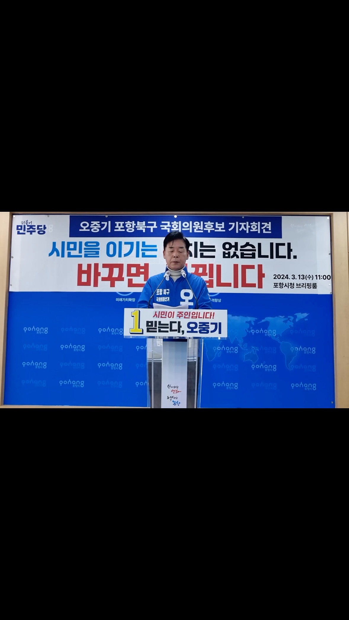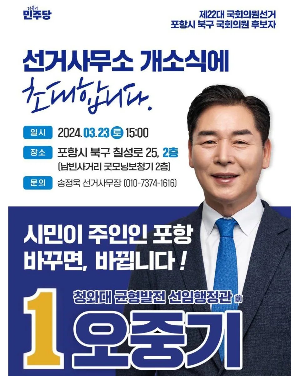 오중기 후보는 “포항의 결단으로 국회의원이 된다면 이는 지역주의 극복이라는 포항 시민의 역사적 결단이며, 대한민국 역사에 길이 남아 후세에 전설처럼 회자될 것”이라고 밝혔습니다2. 그는 또한, “윤석열정부의 폭압과 무능으로 민생이 사라진 암울한 시기에 지역주의를 방패막이 삼고 있는 국민의힘을 이겨야 하는 막중한 책임감을 느낀다. 반드시 승리하여 포항과 대한민국의 미래를 개척해 나가겠다”고 밝혔습니다. 그는 또한, “시민들이 이재명 대표 체제하에서 민주당이 검찰독재만 비판하지, 민생을 위해 뭘 하고 있냐고 하더라”라며 “우리 당이 민생을 위해 노력하고 있지만, 실질적으로 대구·경북 지역에 시민들에게는 그러한 노력이 피부로 와닿지 않는 어려움이 있다”고 전했습니다.