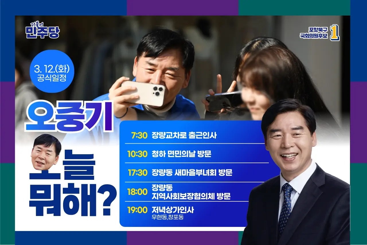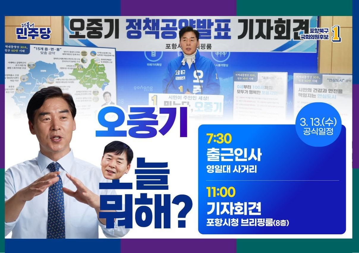 더불어민주당의 오중기 후보는 경북 포항 북구에서 활발한 정치 활동을 펼치고 있습니다. 그는 지역 내 총생산 30조 달성, 인구 60만 시대를 위한 포항의 대전환이라는 비전을 제시하며, 이를 위한 다양한 정책 공약을 발표하였습니다. 그의 주요 공약 중 하나는 '지역내총생산 30조원, 인구 60만 시대’이며, 이를 위해 15개 읍·면·동별 맞춤 공약도 제시하였습니다. 오중기 후보는 포항이 경북 제1의 도시로 성장했지만 현재는 인구감소, 지역불균형, 여성과 청년의 일자리 문제, 양극화 등으로 위기에 직면해 있다고 지적하였습니다. 이러한 문제를 극복하고 거점도시로 성장하기 위한 대전환을 강조하였습니다.