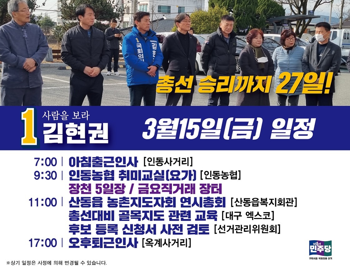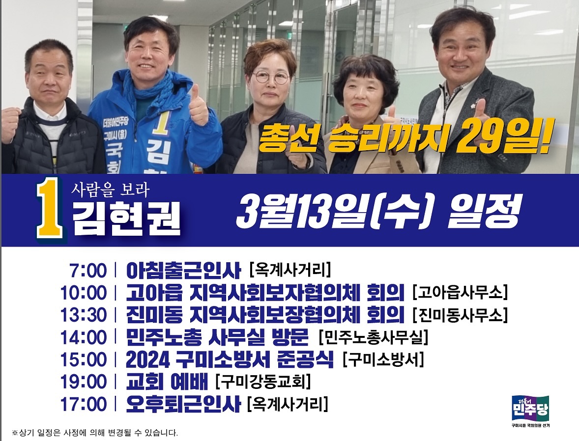 김현권 후보는 구미시을 지역구에서 보수적인 성향이 강하지만, 젊은 층들이 많이 거주하고 있어 야당이 기본적으로 30% 이상 지지를 받고 있는 특이한 곳입니다. 이러한 상황 속에서 김현권 후보는 지역의 정치력 부재를 지적하며, 구미의 정치력을 강화하고 기업들이 다시 구미로 돌아오도록 노력하고 있습니다. 그의 주요 공약 중 하나는 영농형태양광 특화단지와 경북형 풍력단지를 조성하여 구미형 RE100’ 전략을 통해 '전기세 안내는 도시를 만들고, 재생에너지가 필요한 기업을 유치하여 청년 일자리를 창출하고 경제를 회복하는 것입니다. 이러한 활동을 통해 김현권 후보는 구미시을 지역구에서 더불어민주당의 대표적인 후보로서 활발한 활동을 펼치고 있습니다.
