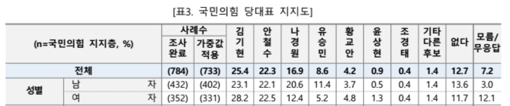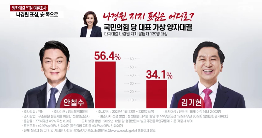 실제 이번 여론조사에서는 다자 대결에 대한 경우의 수 조사를 실시하였는데 총 2,002명 중 784명이었던 국민의힘 지지층은 김기현 25.4%, 안철수 22.3%, 나경원 16.9%로 박빙의 결과를 받아들였습니다. 이러한 상황이라면 과반을 얻지 못했기 때문에 자연스레 결선투표로 가면서 김기현 의원과 안철수 의원의 양자 구도로 바람이 불 가능성이 컸습니다.