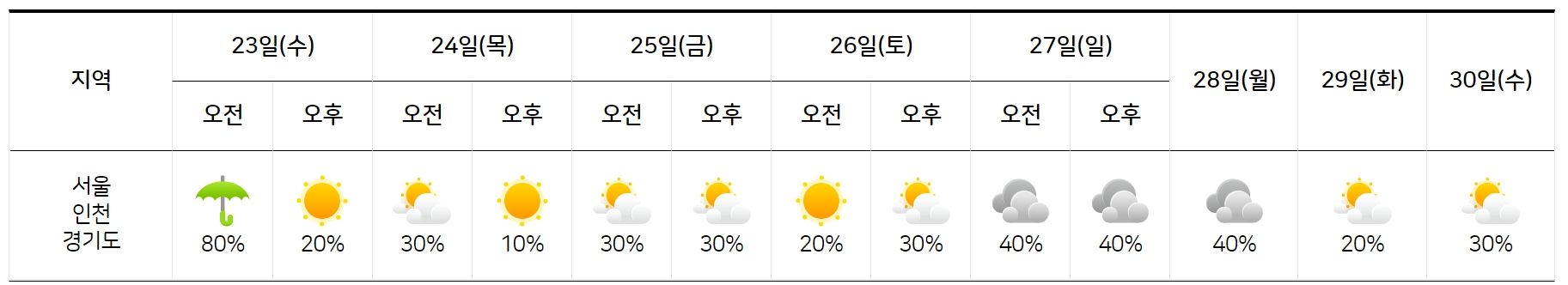 주간 예보를 확인하기 위해서는 중기 예보도 체크를 해야합니다. 22일부터 흐려진 날씨는 23일 수요일 오전까지 강수확률이 80%에 달할 정도로 수도권 대부분이 비가 올 전망이나 24일부터 26일 토요일까지는 대체적으로 맑을 전망입니다.