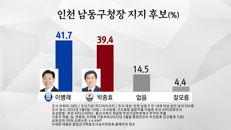 OBS 주관으로 미디어리서치가 실시한 이번 여론조사는 5월 9일에서 5월 110 사이 인천 남동구 거주 만 18세 이상 남녀 504명을 대상으로 무선 휴대전화 가상번호 100%로 구조화된 설문지를 이용해 자동응답전화방식으로 실시하였으며 자세한 사항은 중앙선거여론조사심의위원회 홈페이지를 확인하시기 바랍니다.