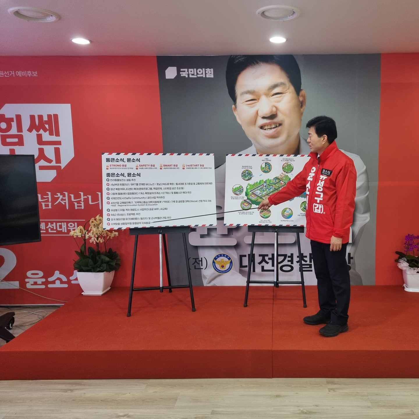 윤 후보는 2024년 총선에서 본격적인 선거전에 돌입하였으며, 이날 개소식에는 이상민 대전시의장, 이은권 대전시당위원장, 서철모 서구청장 등 지역 주요 인사를 비롯해 지지자 약 800명이 참석하였습니다2. 그는 "윤석열 정부 성공을 뒷받침하기 위해 최선을 다하고 유성과 대한민국 발전을 위해 최선을 다하겠다"고 강조하였습니다