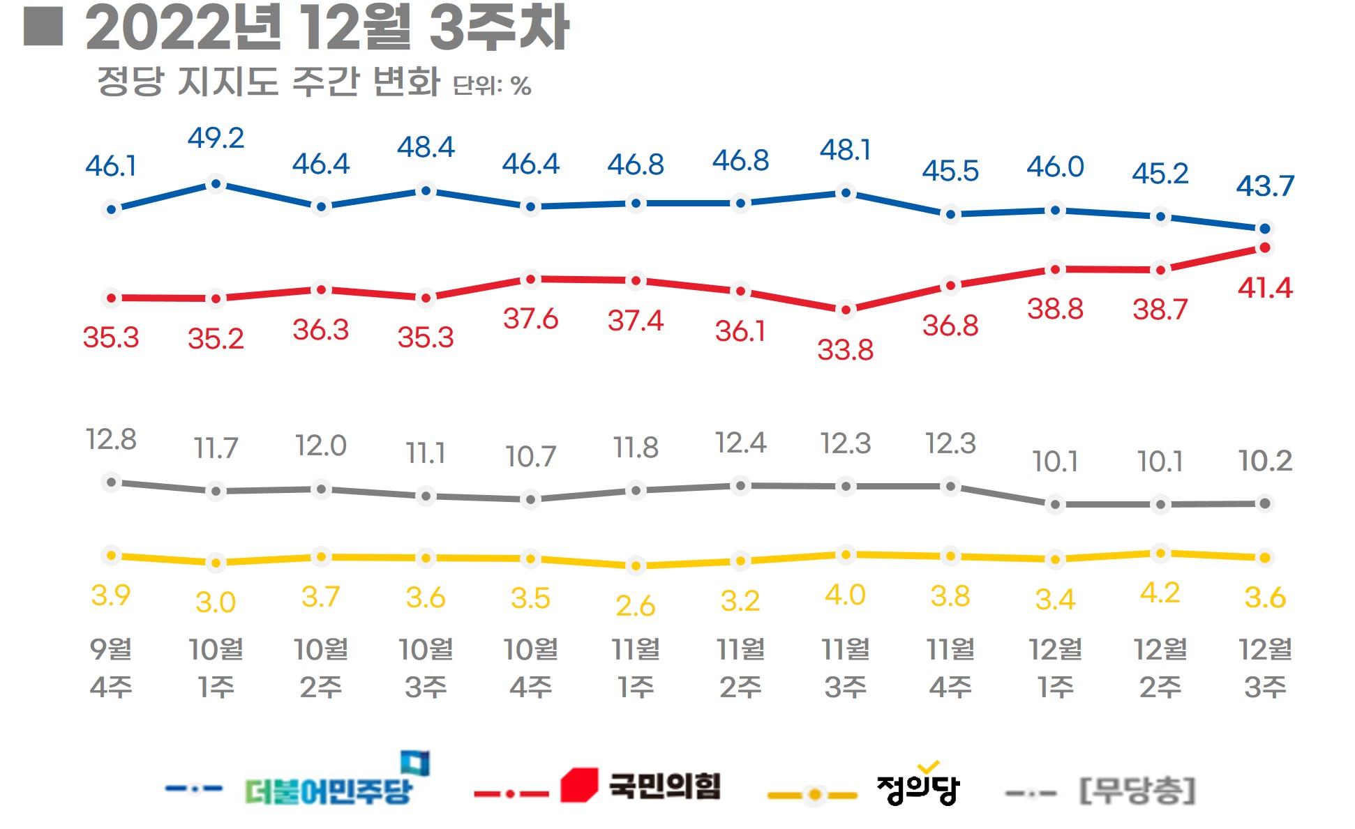 대통령 지지율 및 정당 지지율 리얼미터 여론조사 결과(12월 2주차) 전국적인 총파업으로 국가 동맥인 물류를 인질로 정부와 협상에 나섰던 화물연대의 꿈이 윤석열 정부의 강력한 대처로 유야