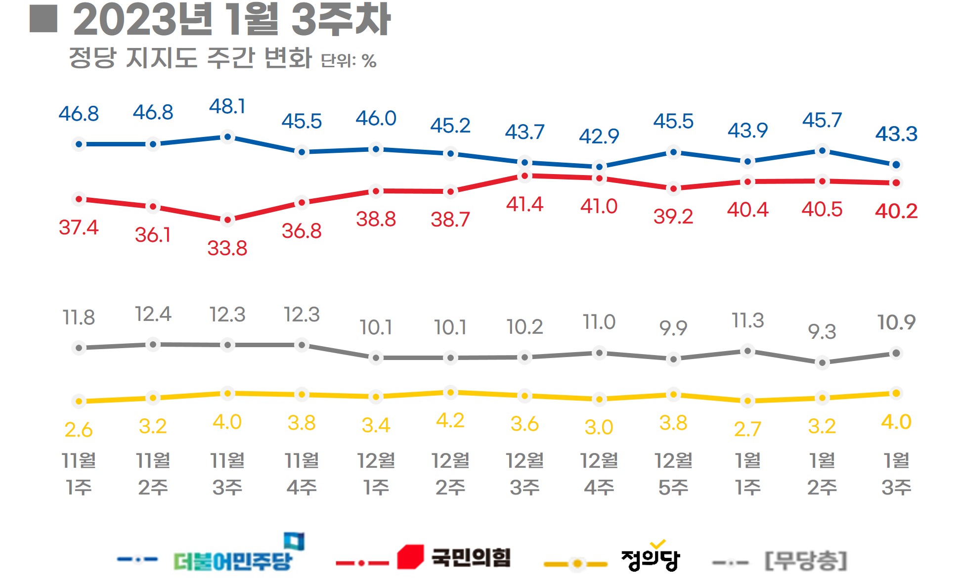 이러한 상황에서 정당 지지율은 두 거대 당은 모두 답보상태인 상황입니다. 더불어민주당은 당 대표인 이재명 의원에 대한 검찰 수사가 이어지며 방탄 국회의 모습과 대안 없는 모습으로 실망감을 주고 있으며 여당인 국민의힘은 국민의힘대로 당권을 두고 누가 더 대통령과 가깝냐는 싸움만 펼치고 있으며 당원 100%로 실시되는 국민의힘 경선에 관심을 보일 신규 당원 유입도 제한되다보니 결과적으로 지지율은 답보 될 수밖에 없어 보여 이번 주 양당의 성적표는 더불어민주당은 2.4% 하락한 43.3%, 국민의힘은 0.3% 하락한 40.2%로 나타났습니다.