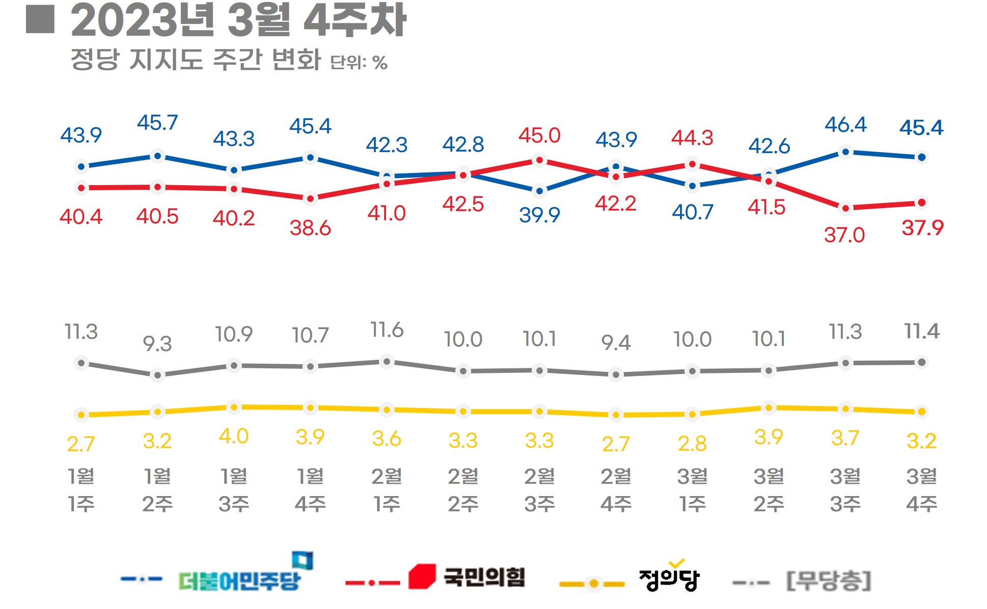 이런 분위기 속에 정당 지지율 역시 야당에게 더 힘이 가 있는 모양새이긴 합니다. 하지만 더불어민주당 역시 개딸, 수박 등 당내 싸움이 이어지는 가운데 이재명 대표의 거취에 따라 당의 지지율이 요동칠 수 있는 만큼 양당의 이슈에 따른 지지율 변화는 앞으로도 심화될 모양새입니다. 또한 4월에 실시하는 재보궐선거는 국회의원 선거가 전주을, 지자체장 선거가 창녕군 정도로 중앙 정치에 미치는 파급효과가 크지 않은 만큼 심판론이나 정권지지 여론이 강했다라는 평을 하기에는 부족한 시험이 될 것으로 보입니다.