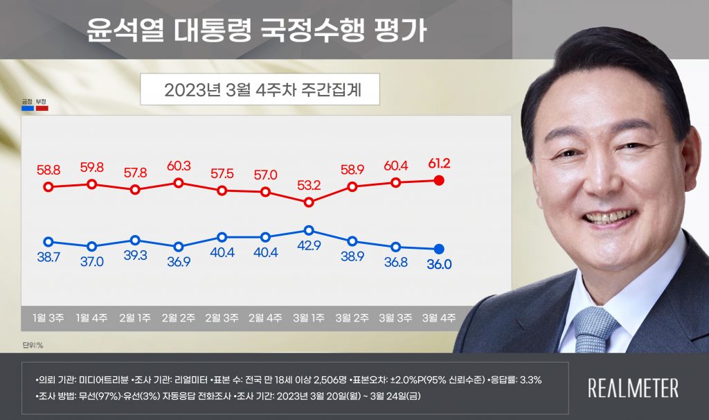 일본과의 관계 개선에는 성공했을지 모르겠지만 강제징용 해법과 관련된 논란, 이어지는 한일관계 논란, 주 69시간 논란 등 당의 지도부가 구성되며 안정을 찾을 것으로 보인 국민의힘과 대통령의 지지율은 굵직한 이슈앞에서 지지율은 풍전등화와도 같아 보입니다. 이슈가 지지율을 덮고 있는 결과가 이어지고 있는 이번 주 리얼미터 여론조사 결과를 자세히 알아보겠습니다.