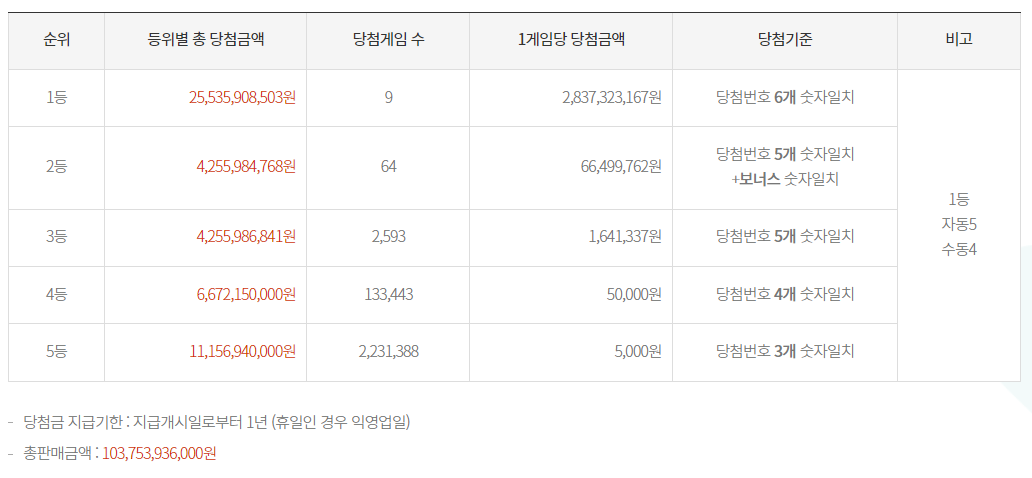 5등 당첨금 : 5,000원, 인원 2,231,388명